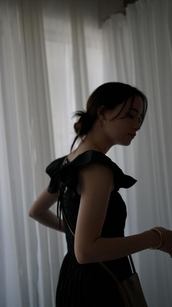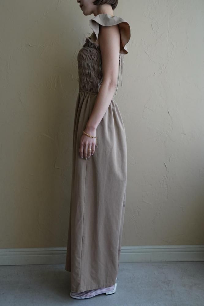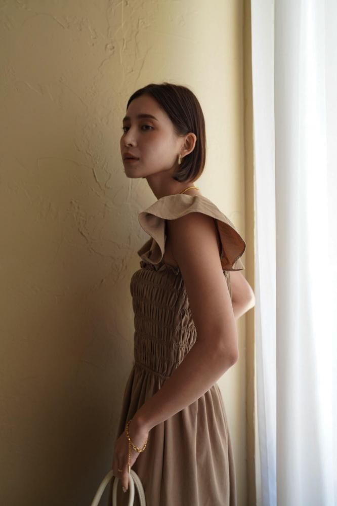 ノースリーブのショルダーにフリルを施した華やかなデザイン。