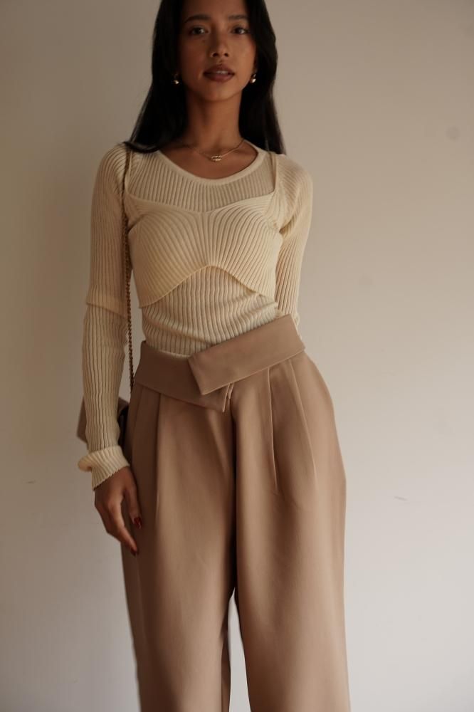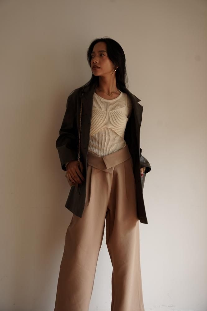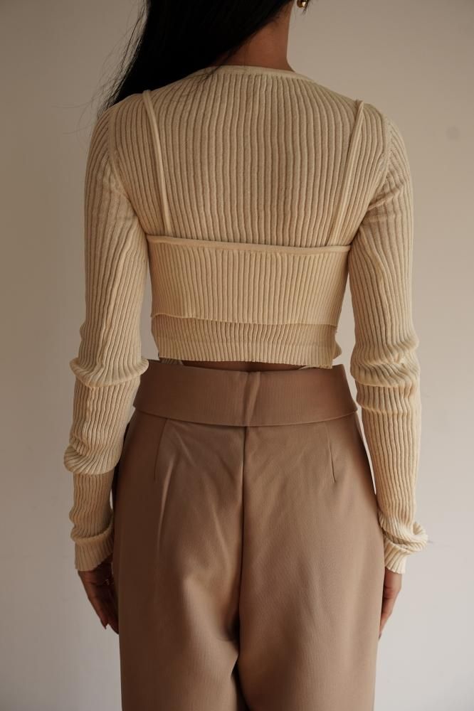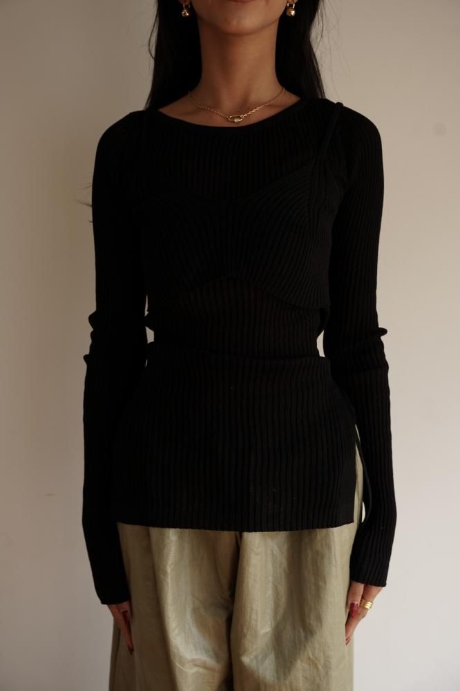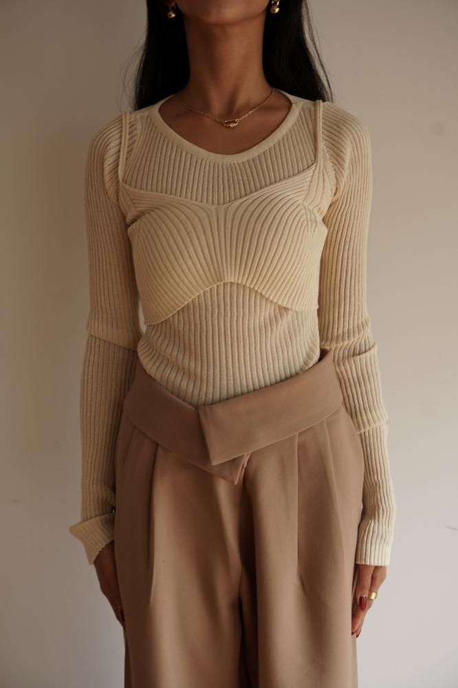 ショート丈のキャミをオンしたシルエットに、リブニットのタイト感と編みの凸凹感でスタイルアップ効果も期待できます。