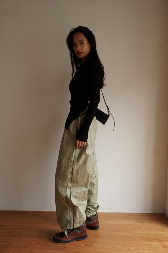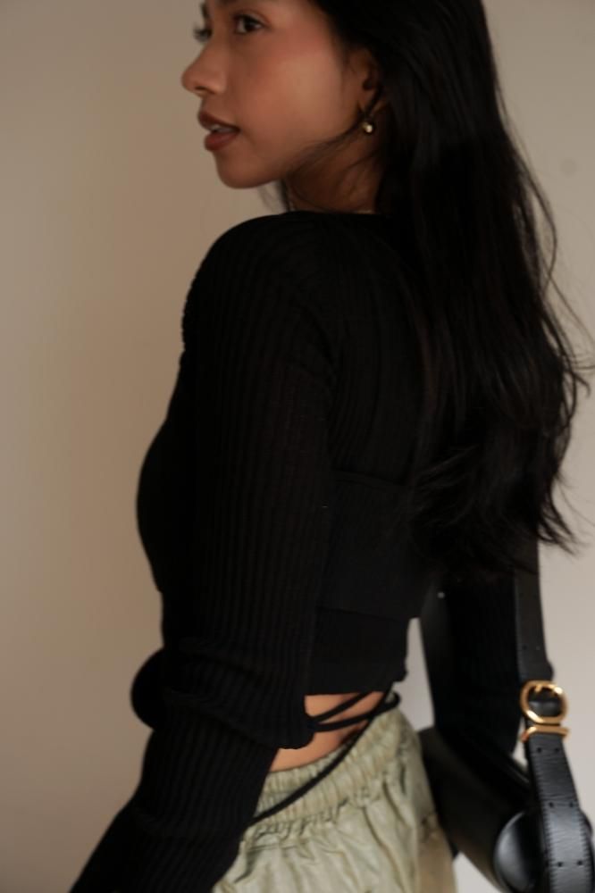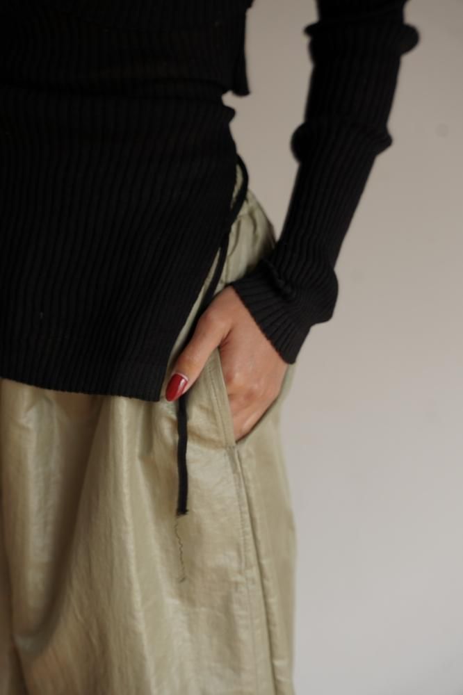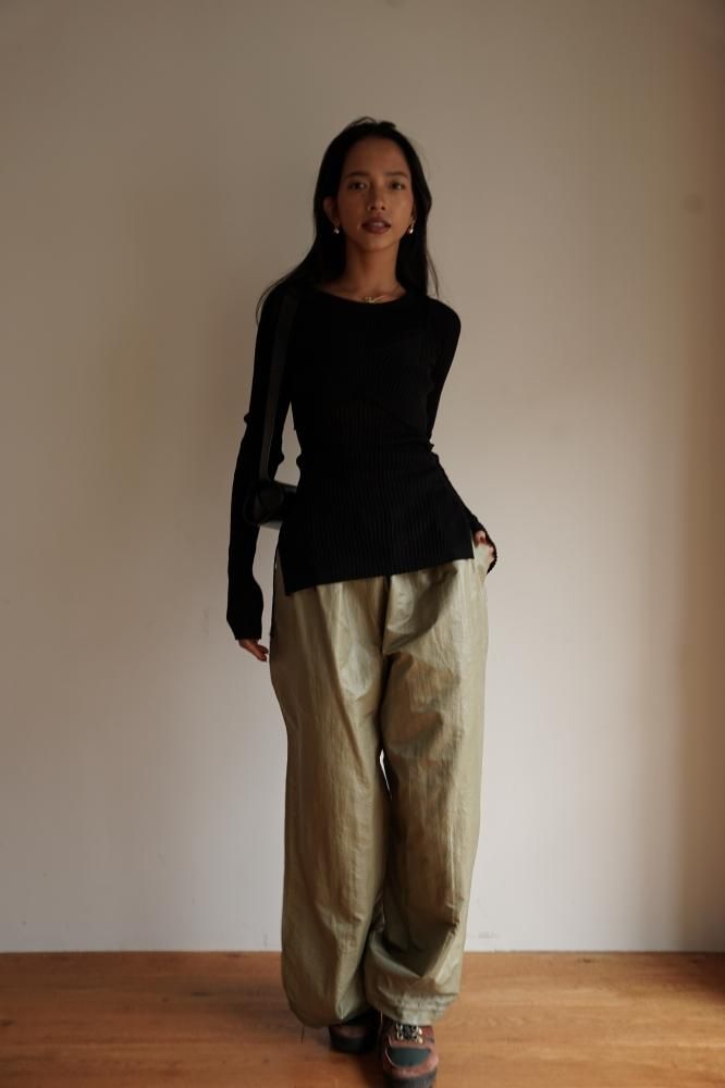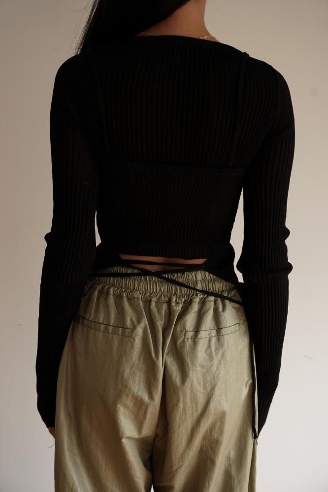 ショート丈のキャミをオンしたシルエットに、リブニットのタイト感と編みの凸凹感でスタイルアップ効果も期待できます。