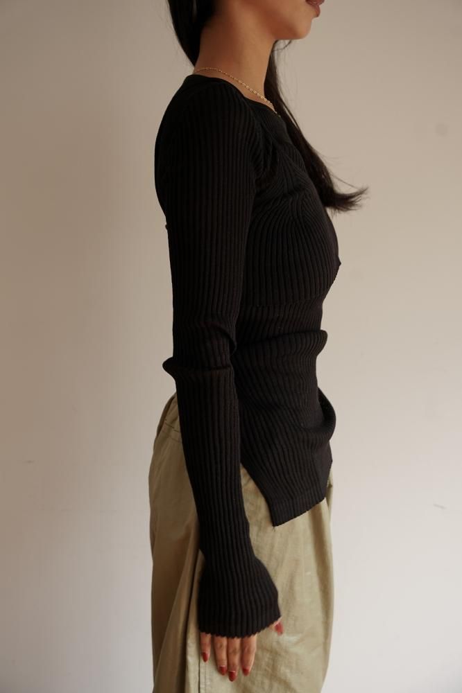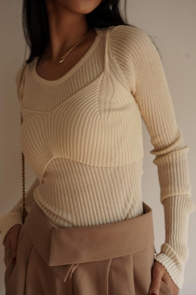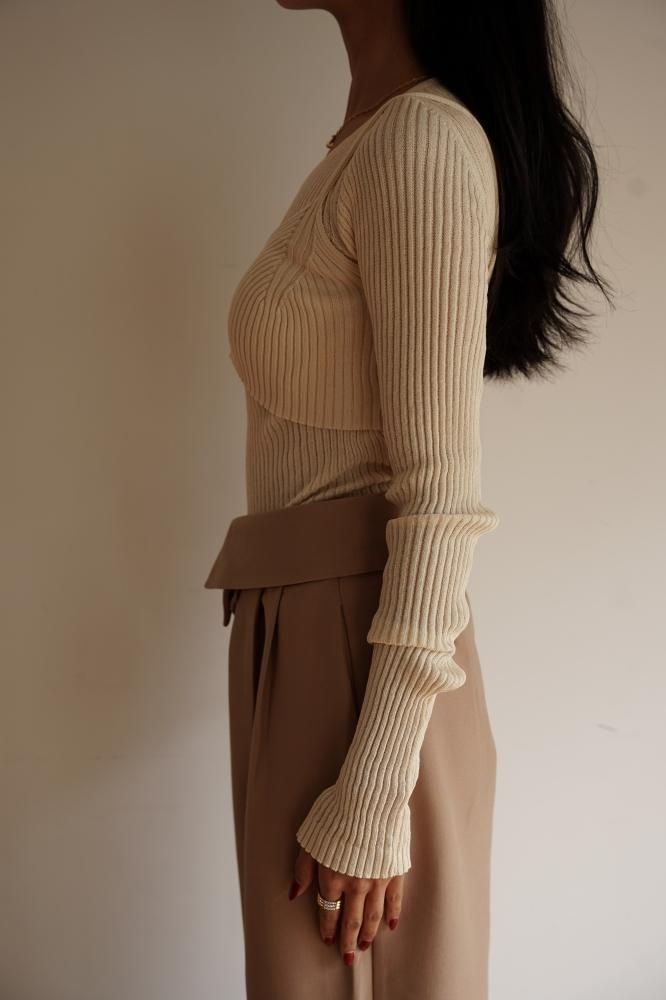 レイヤード風デザインが目を惹くスクエアネックリブニットトップス