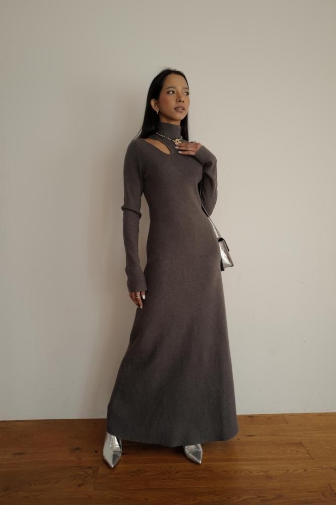 洗練されたショルダーカットデザインが魅力のカットアウトニットワンピース