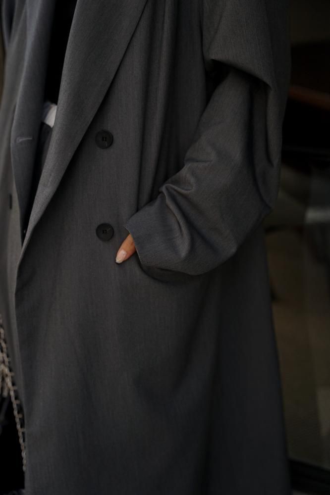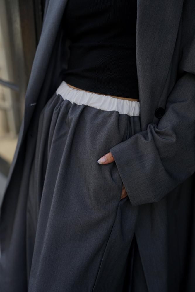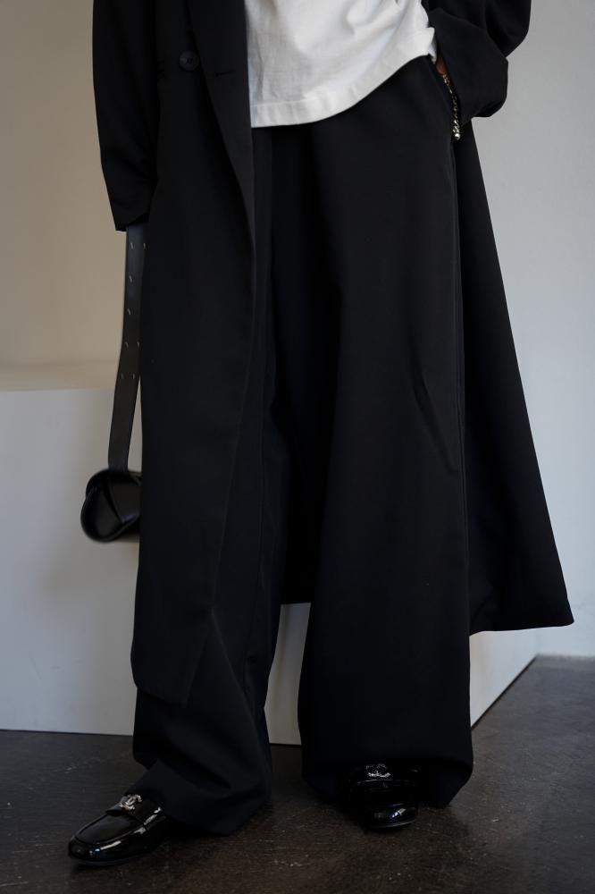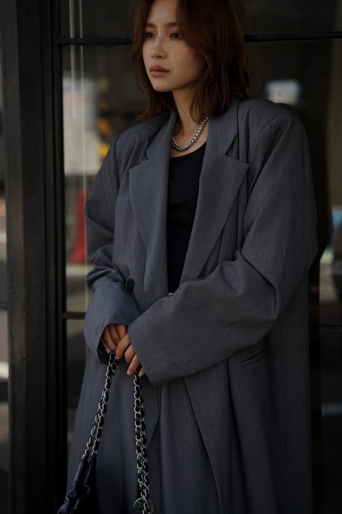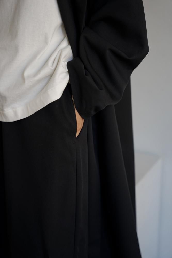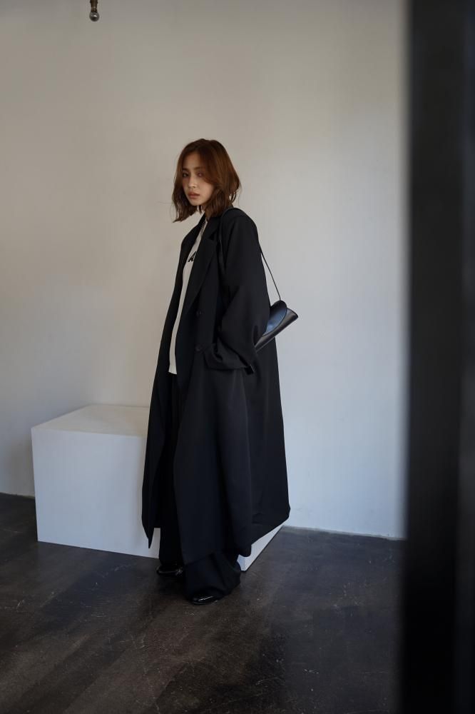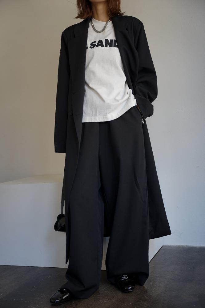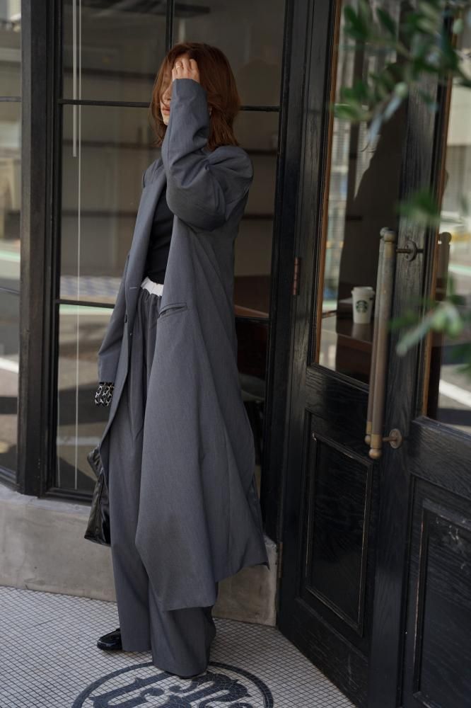 シックなロングジャケットとリラックス感のあるバイカラーパンツのセットアップ