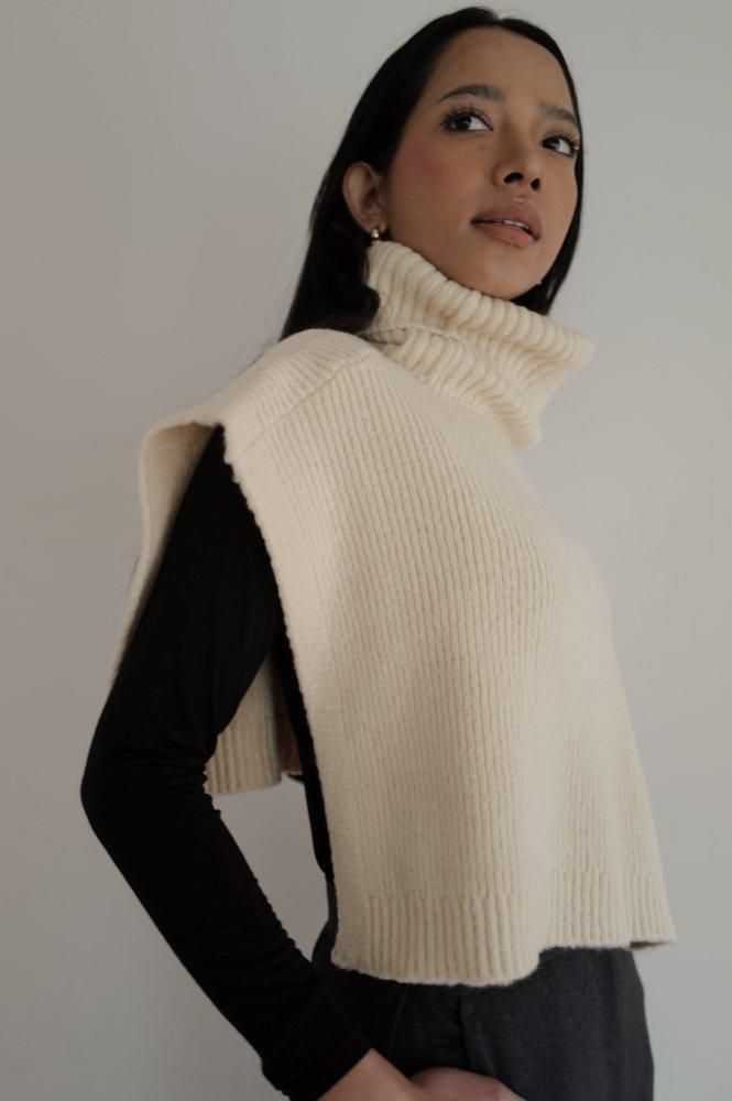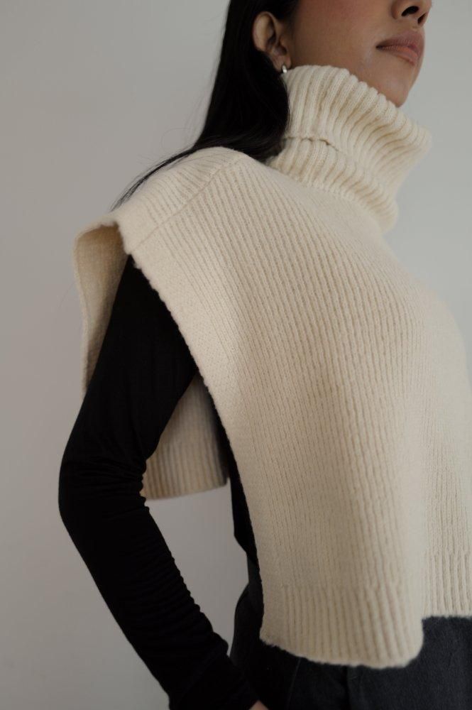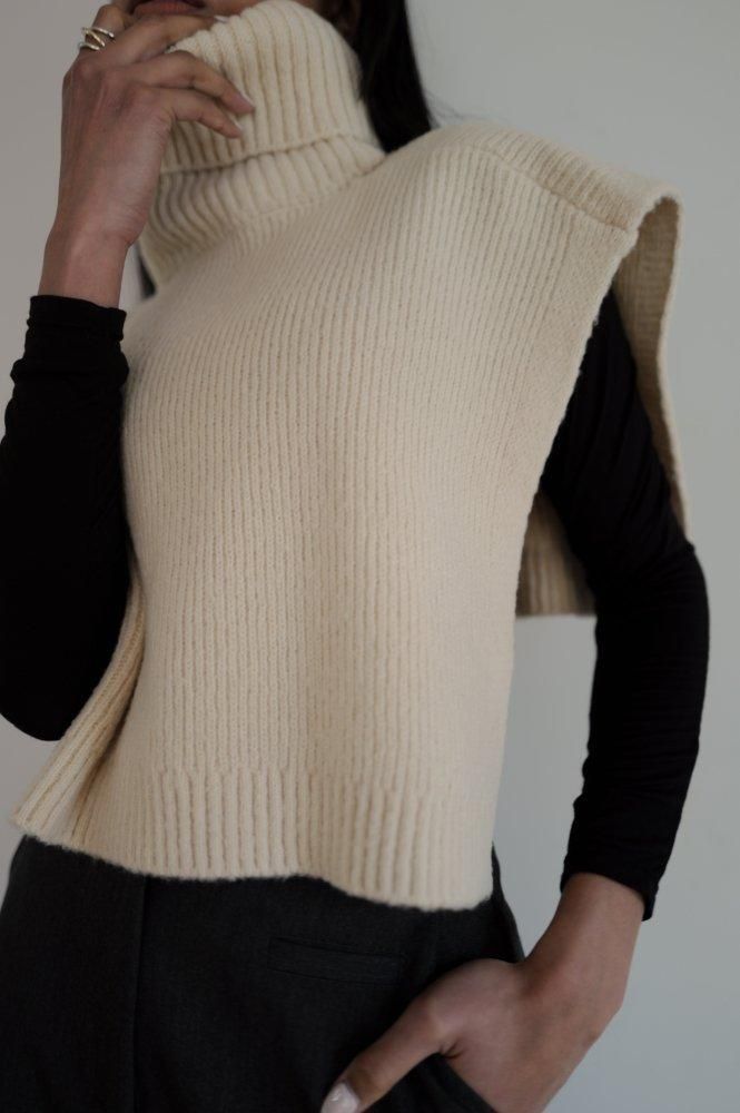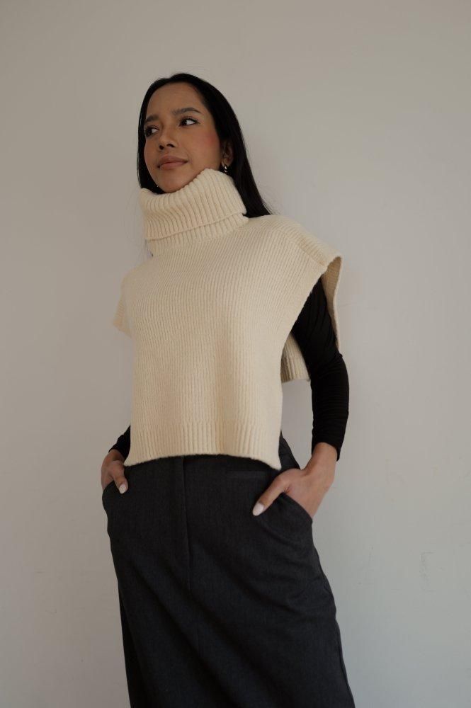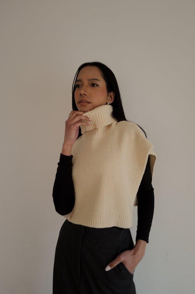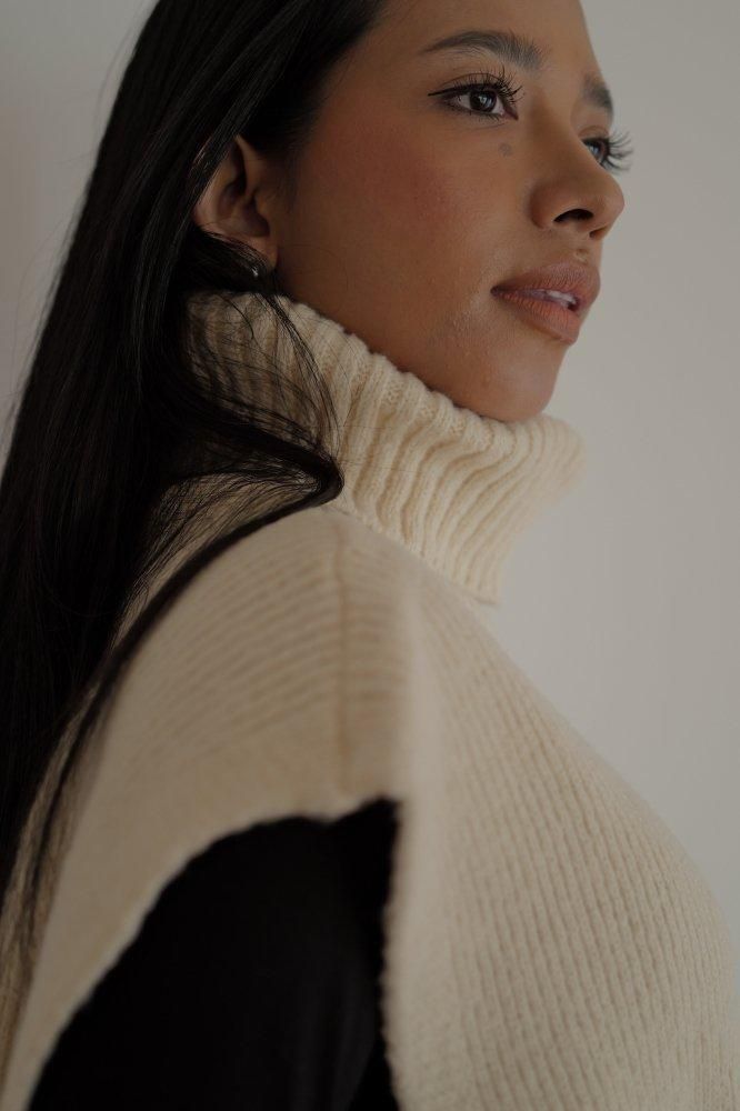 ゆったりとしたタートルネックが優雅さを加え、首周りを暖かくしながらスタイリング。