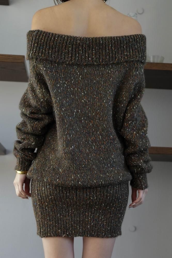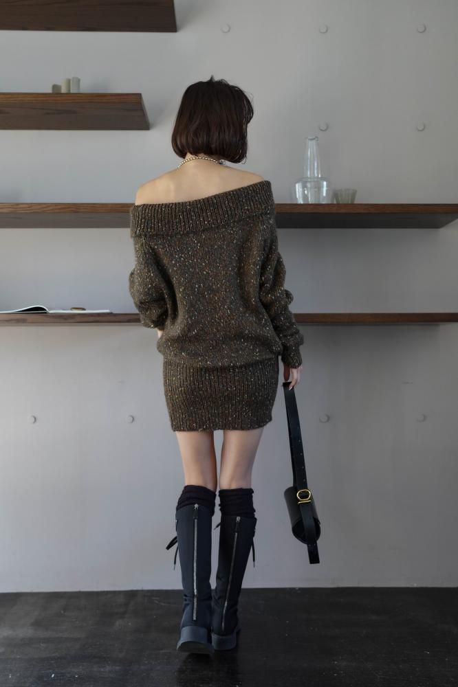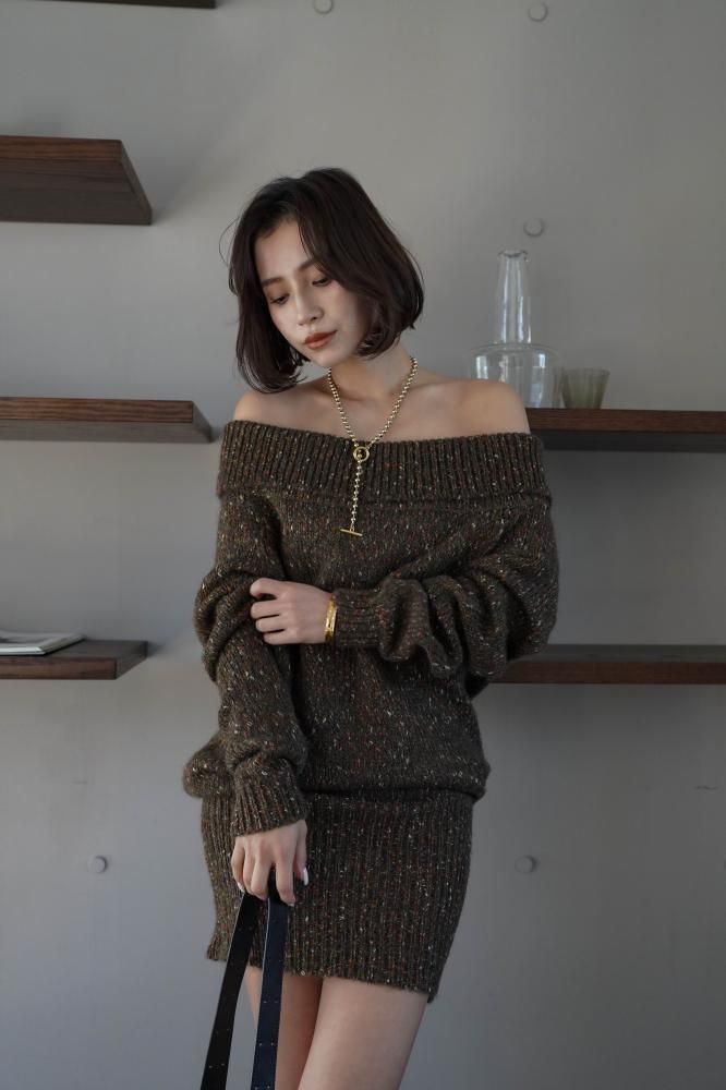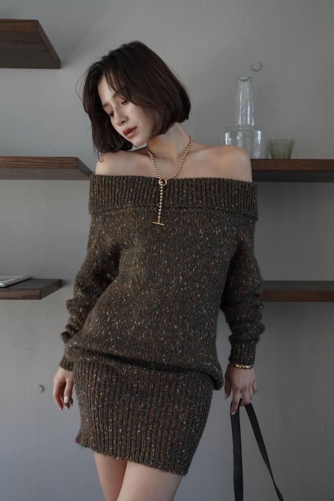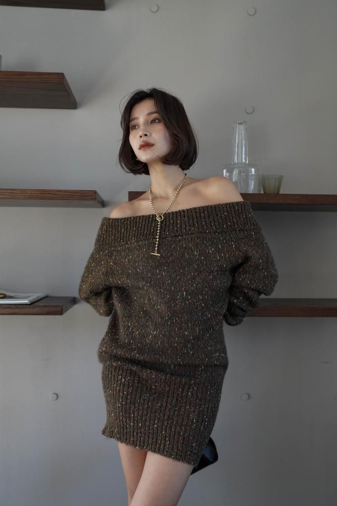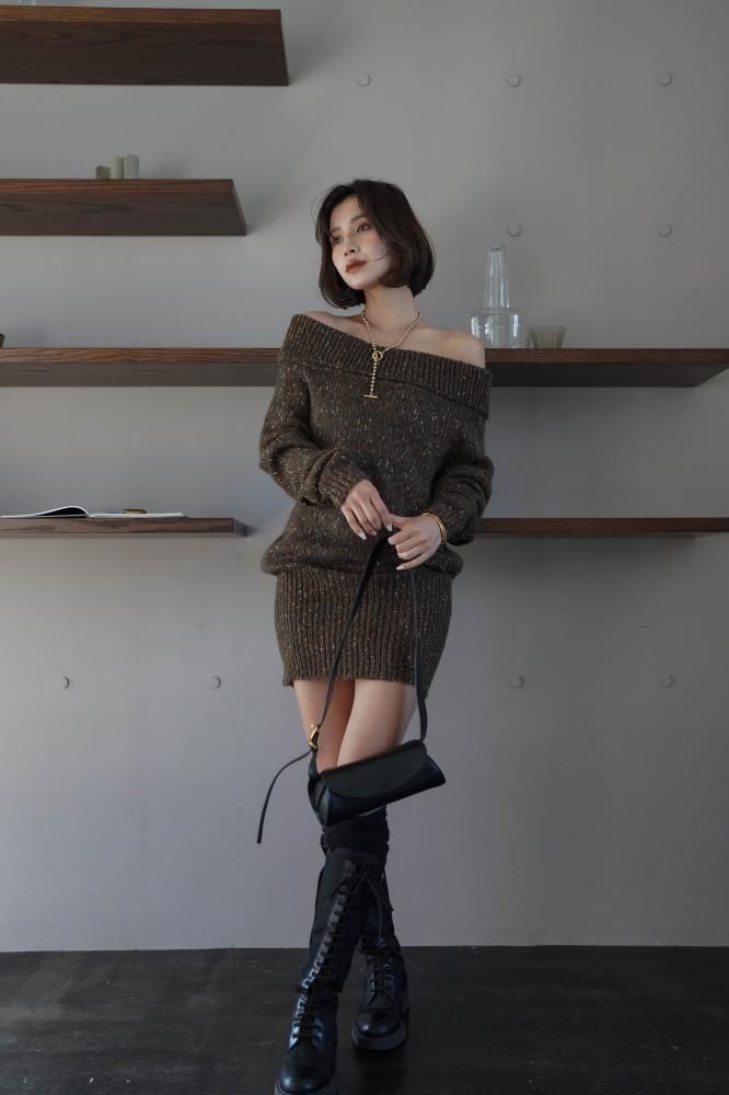 フェミニンな雰囲気を演出するオフショルニットミニワンピース