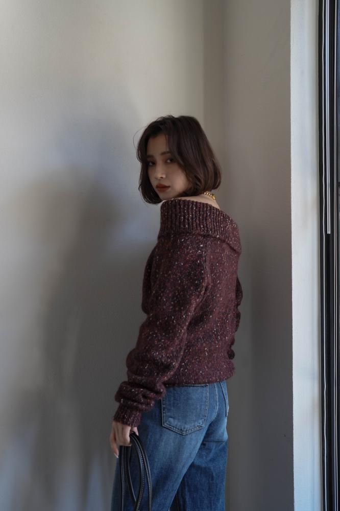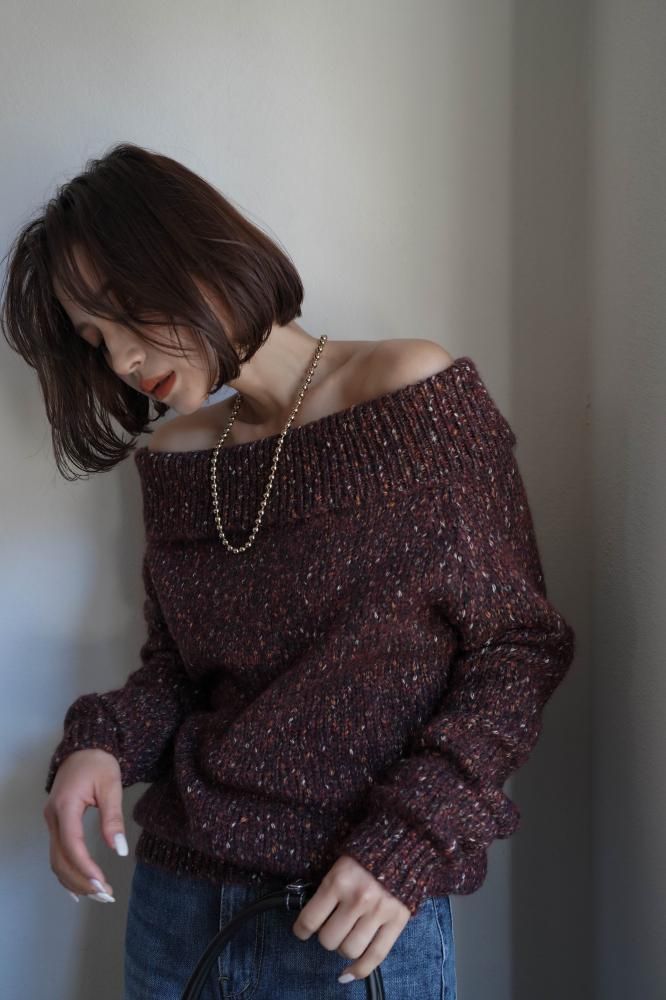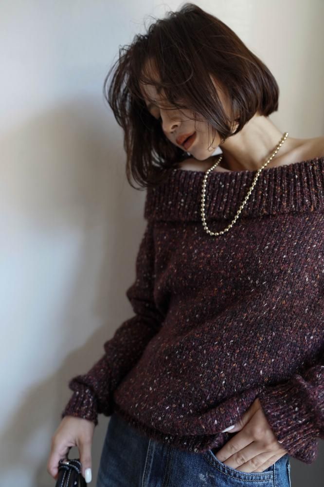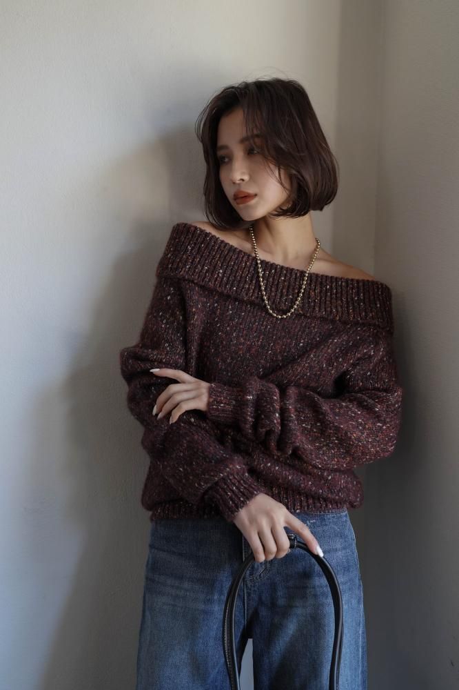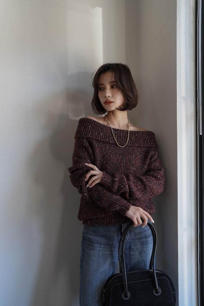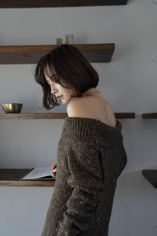 フェミニンな雰囲気を演出するオフショルニットミニワンピース