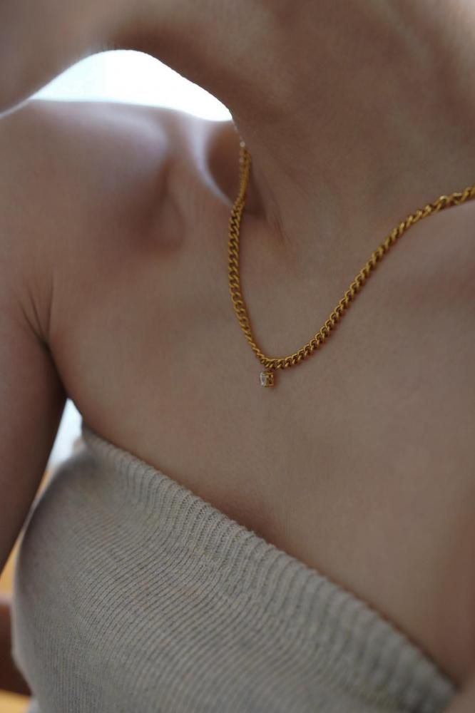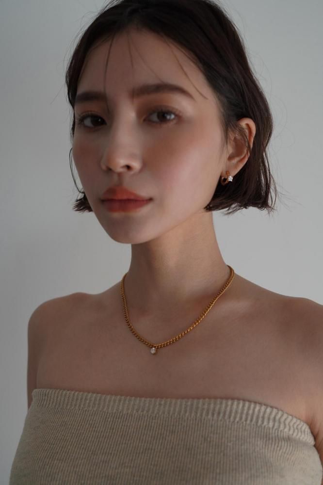 シンプルながらもキュービックジルコニアの繊細な輝きが、デコルテに上品なアクセントをプラス。
