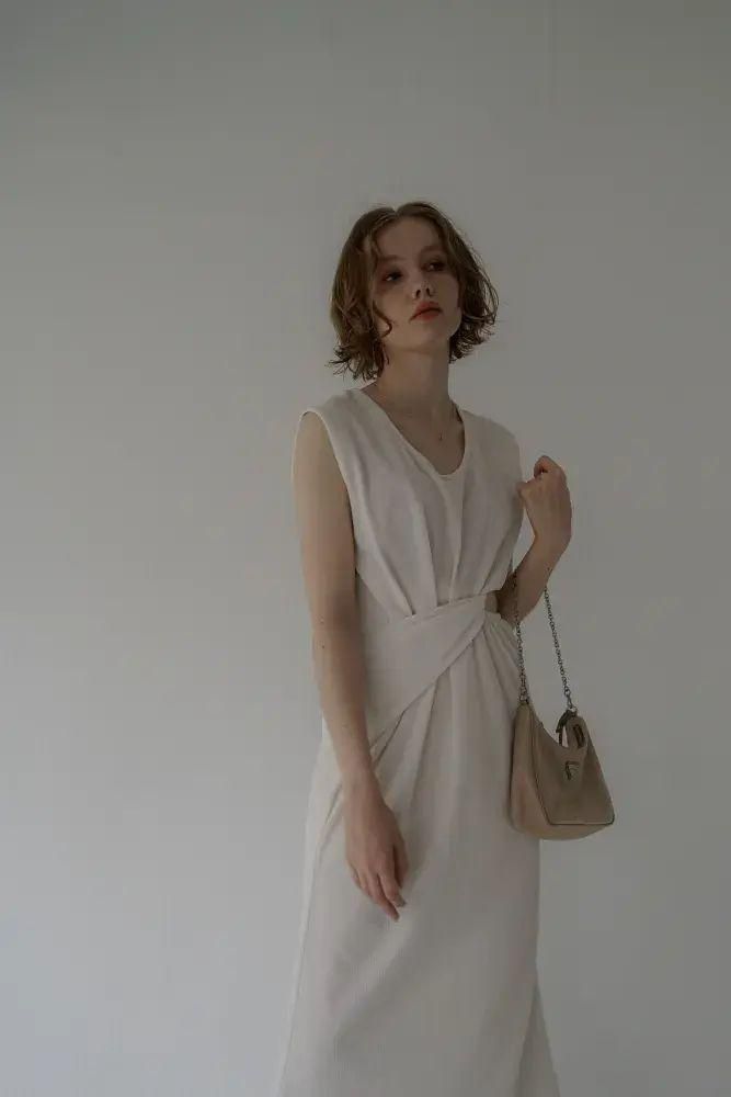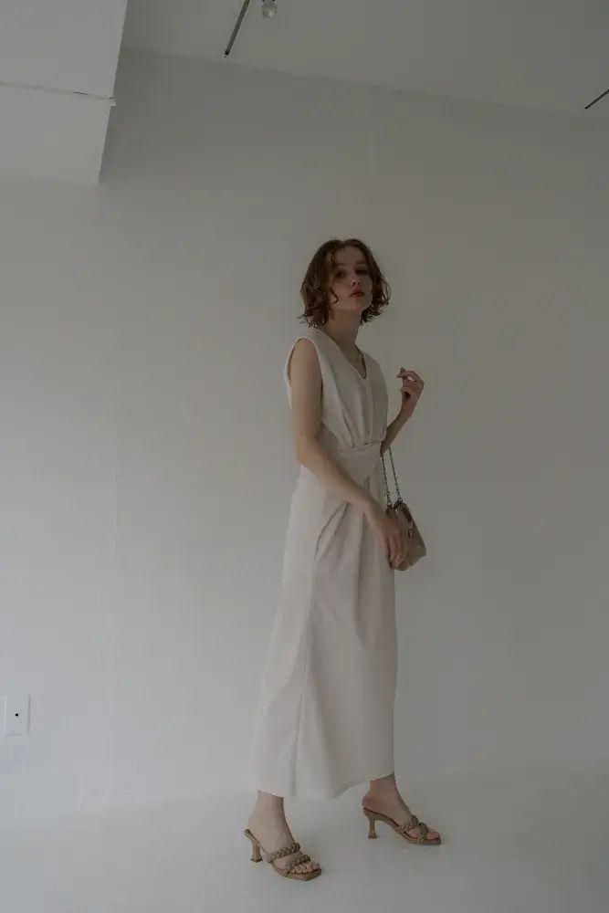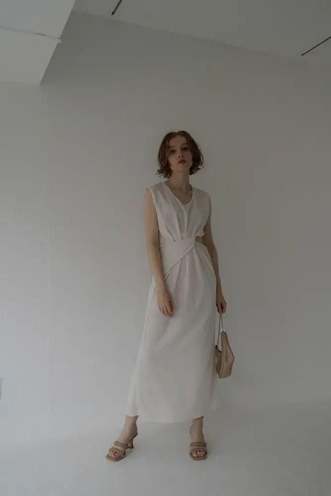 ノースリーブとウエストをカットしたデザインにより涼し気な印象を与えながらもロング丈で落ち着いた大人の女性らしさを演出するデザインワンピースです。