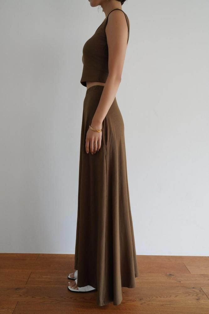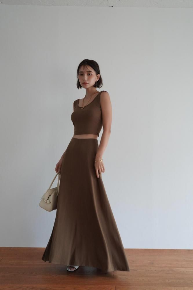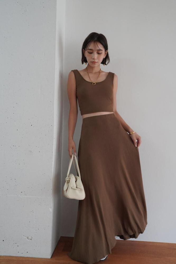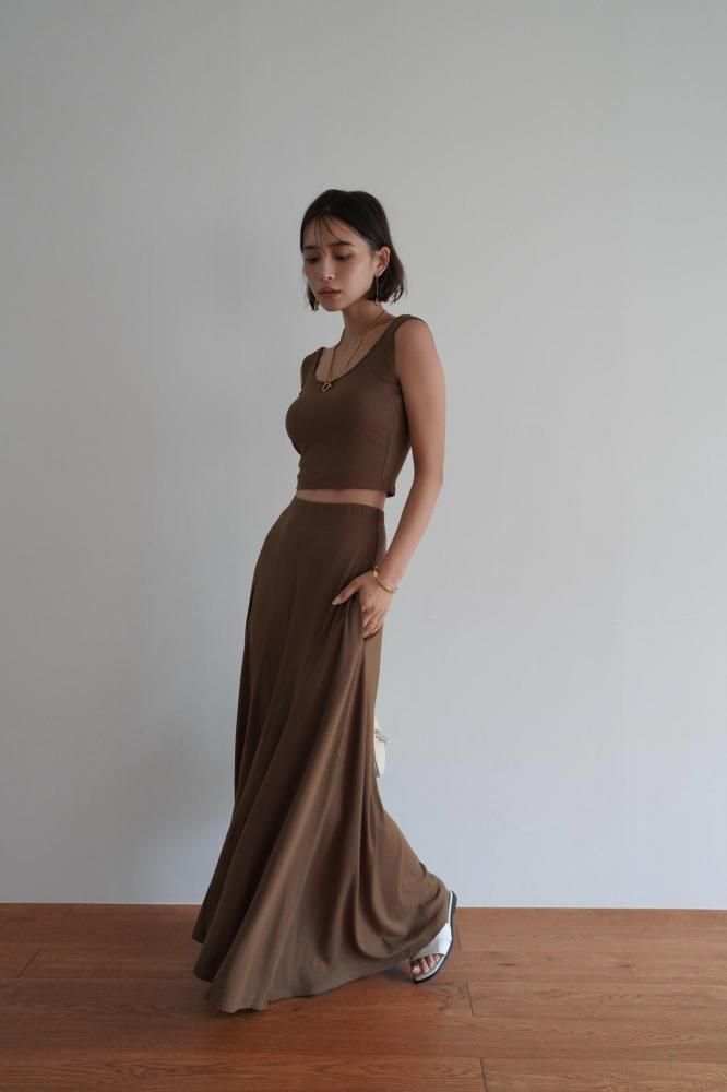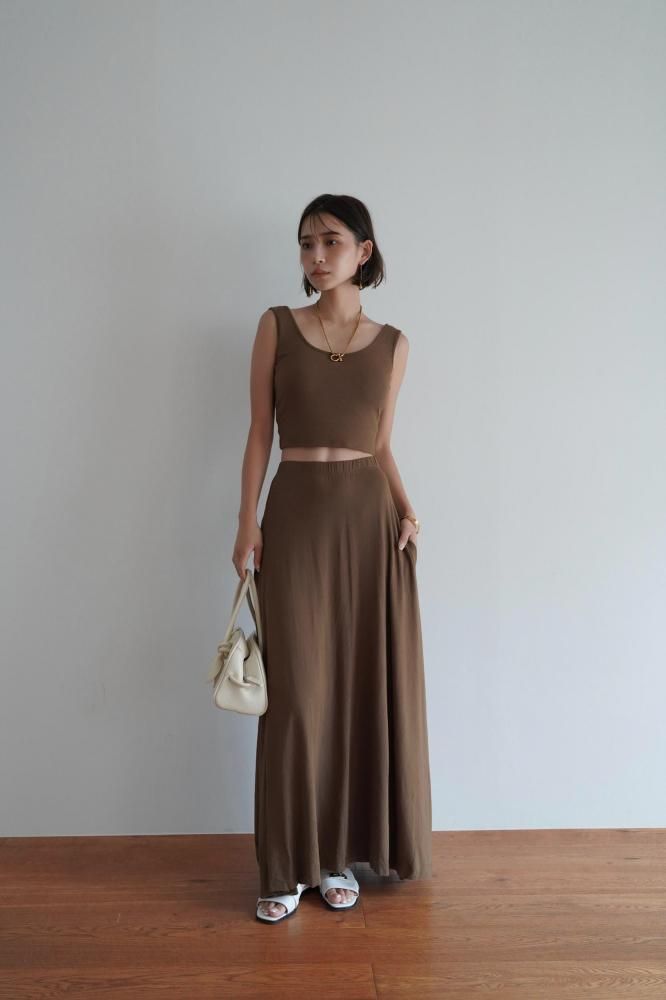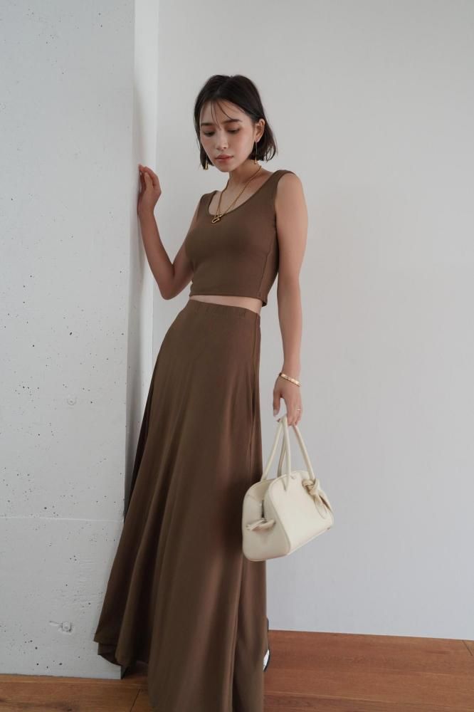 触り心地の良いレーヨン混素材で仕上げたカップ付きクロップドトップスとロングスカートのセットアップ。