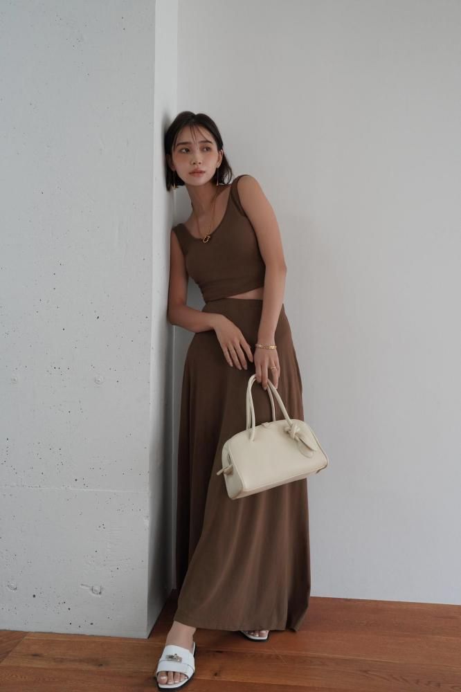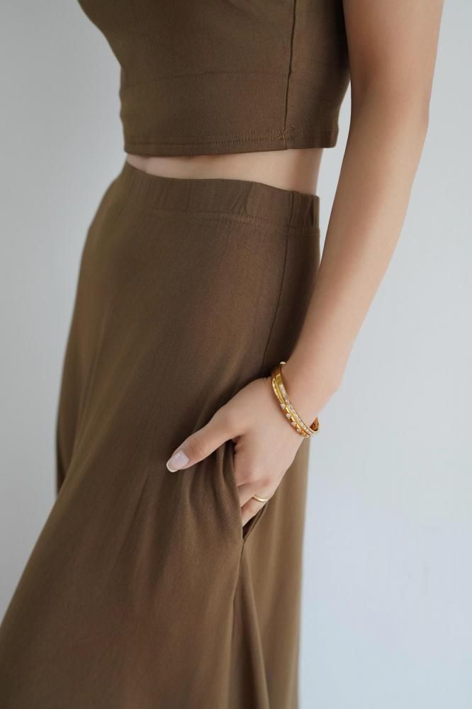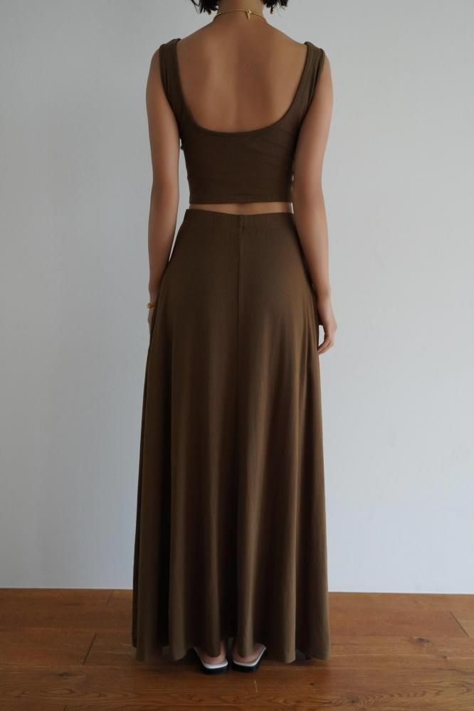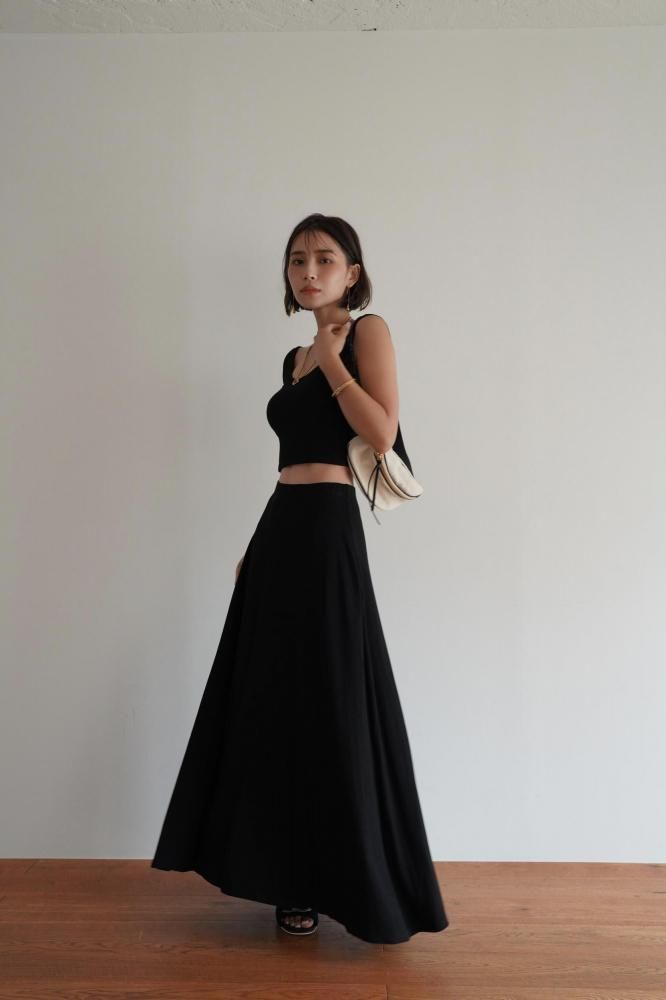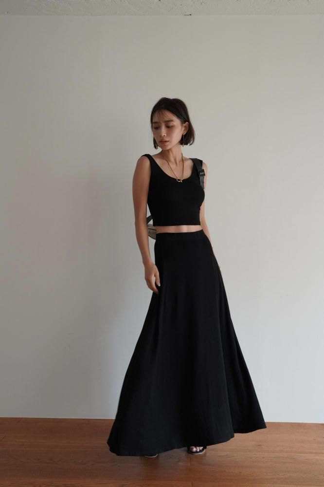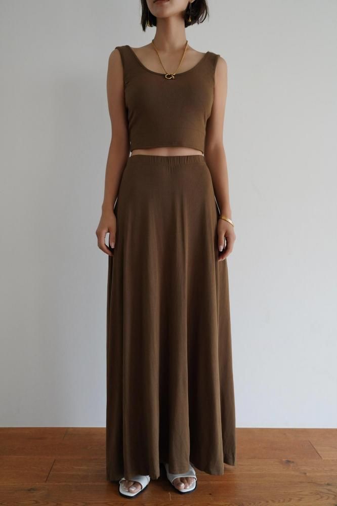 触り心地の良いレーヨン混素材で仕上げたカップ付きクロップドトップスとロングスカートのセットアップ。