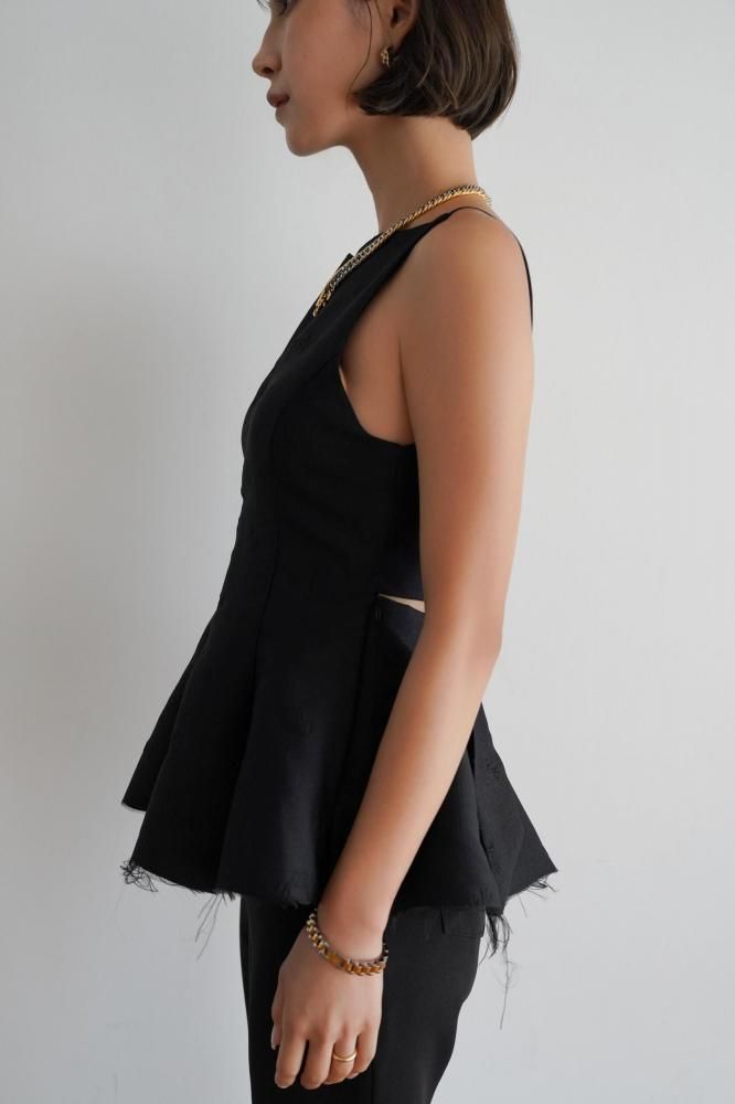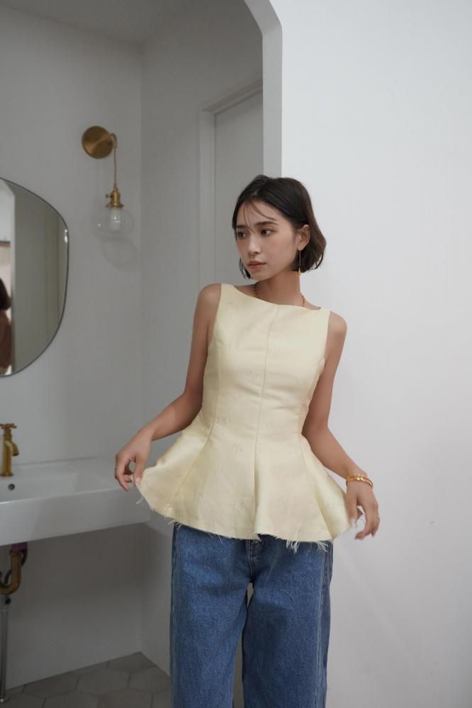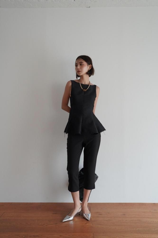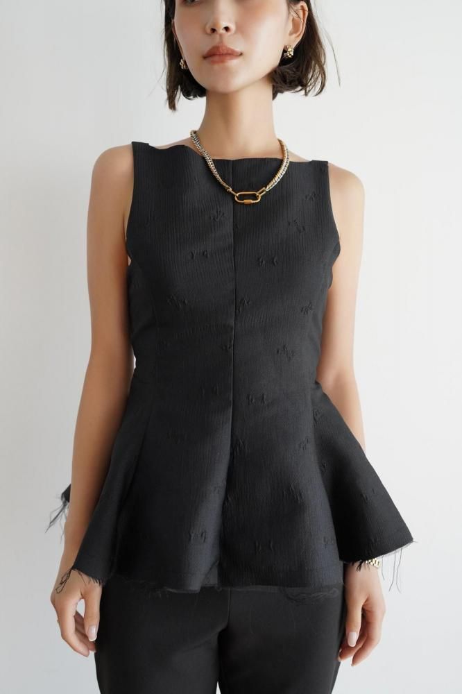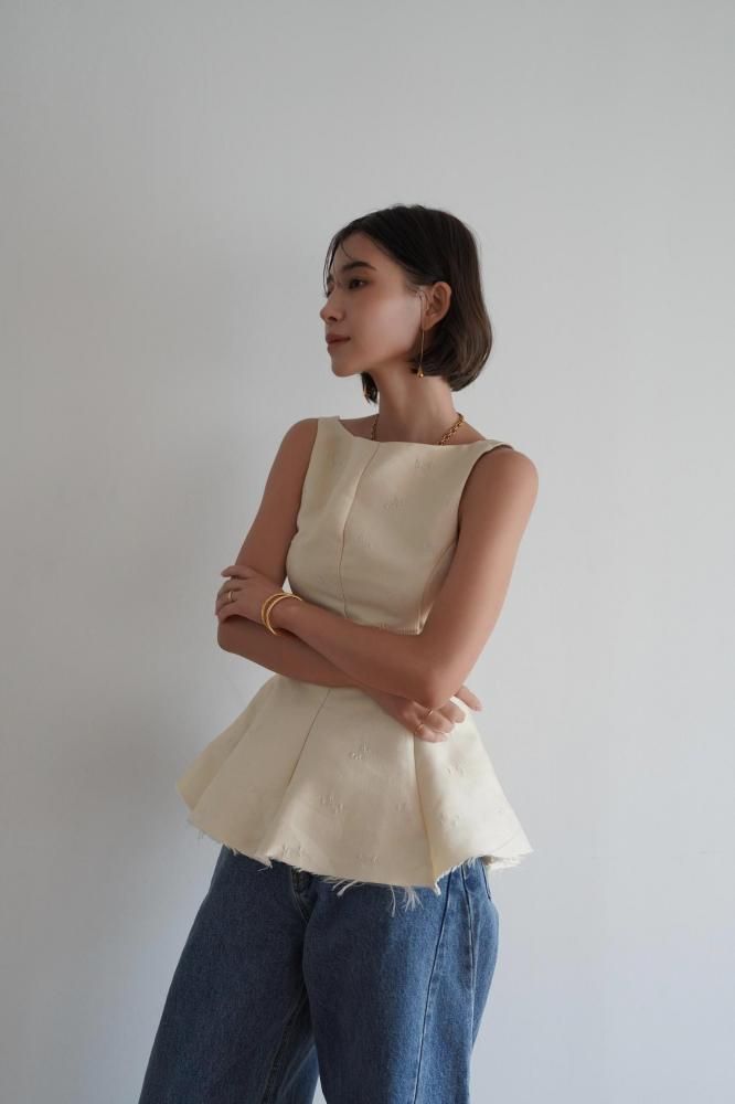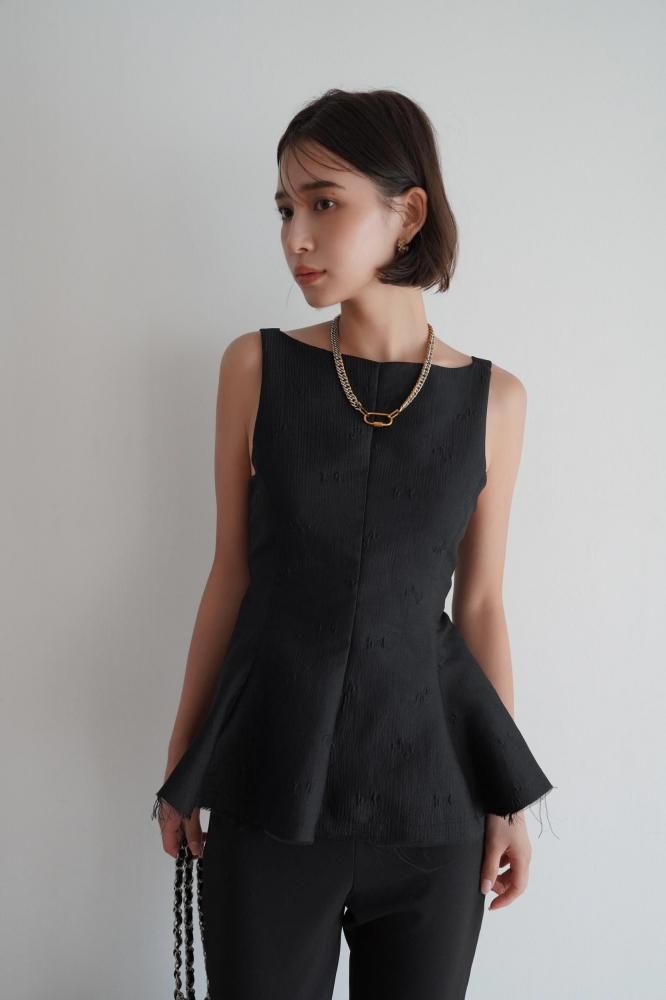 立体感のあるシルエットが美しい、ペプラムデザインのノースリーブトップス。
