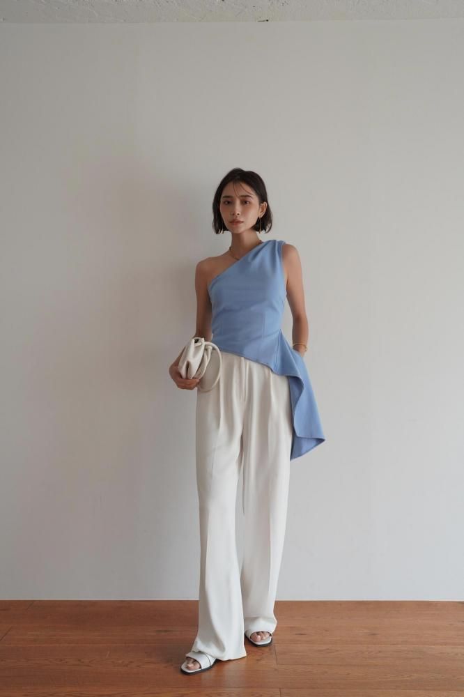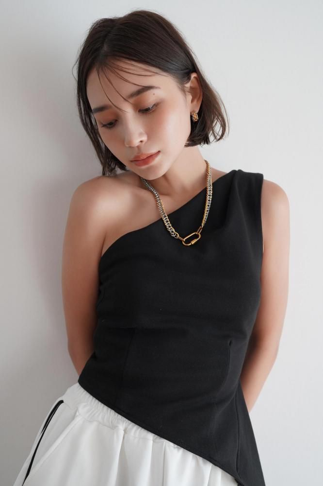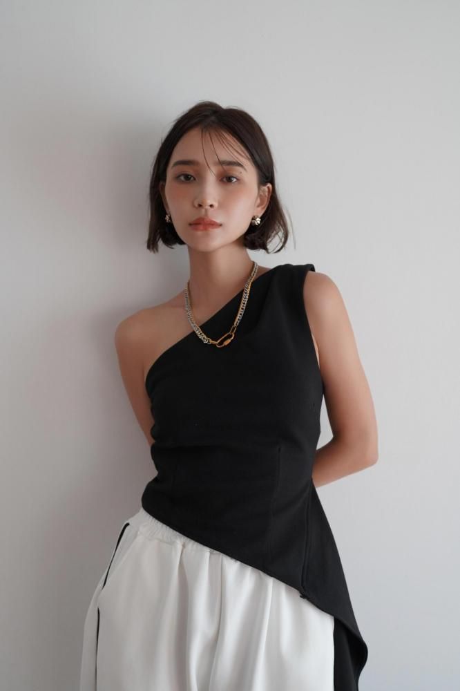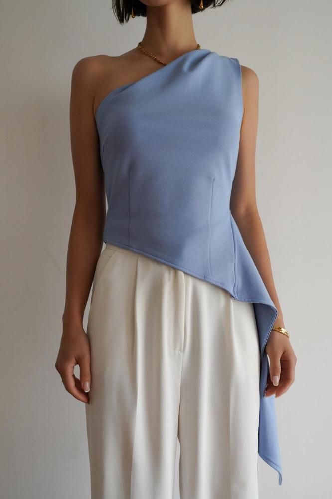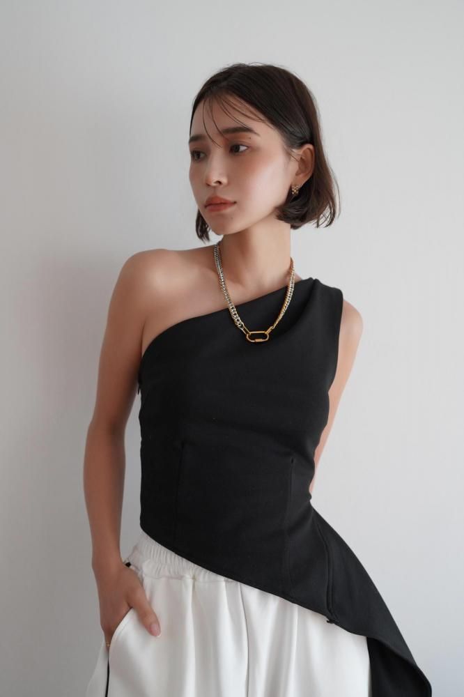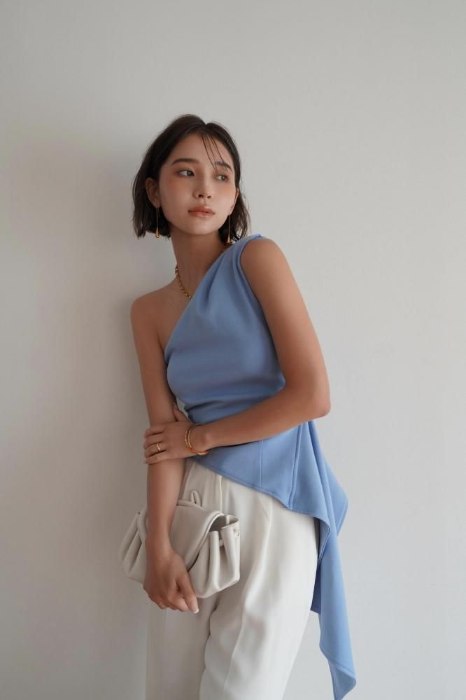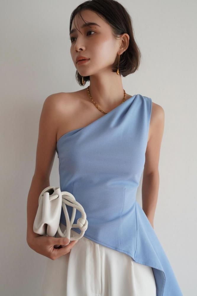 女性らしさを引き立てる、アシンメトリーなドレープが魅力のワンショルダートップス。