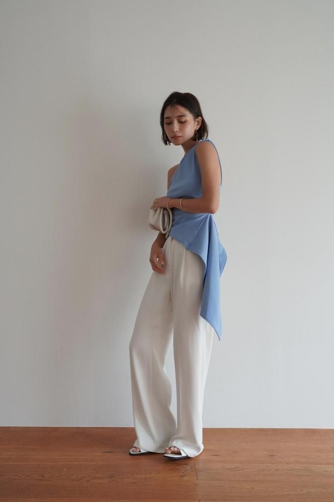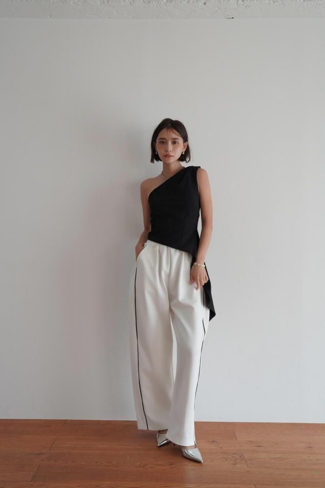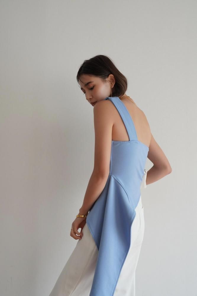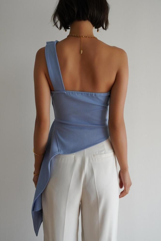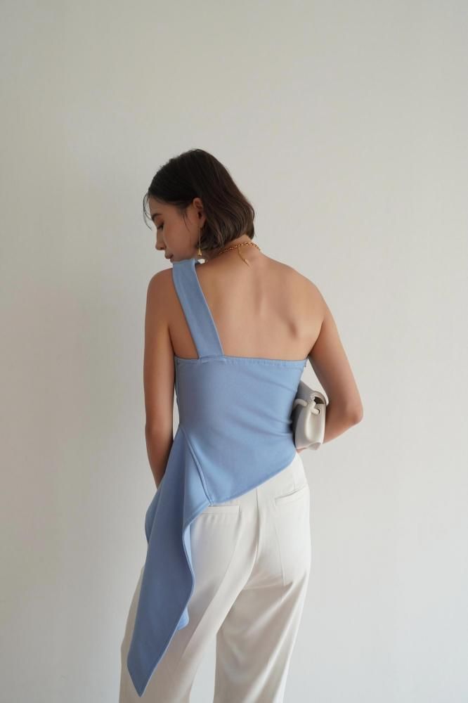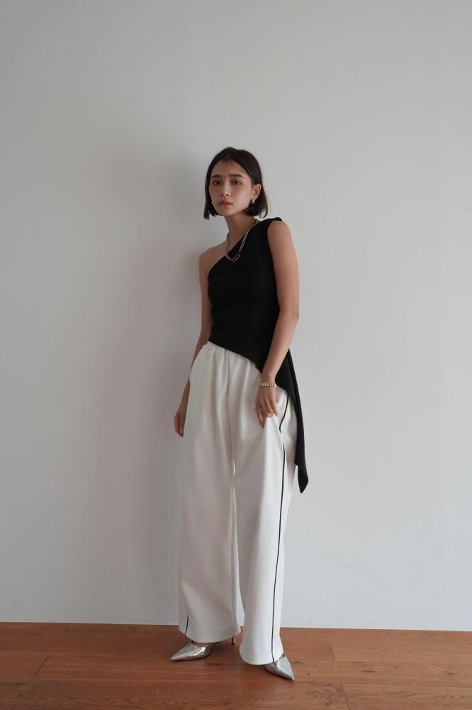 女性らしさを引き立てる、アシンメトリーなドレープが魅力のワンショルダートップス。