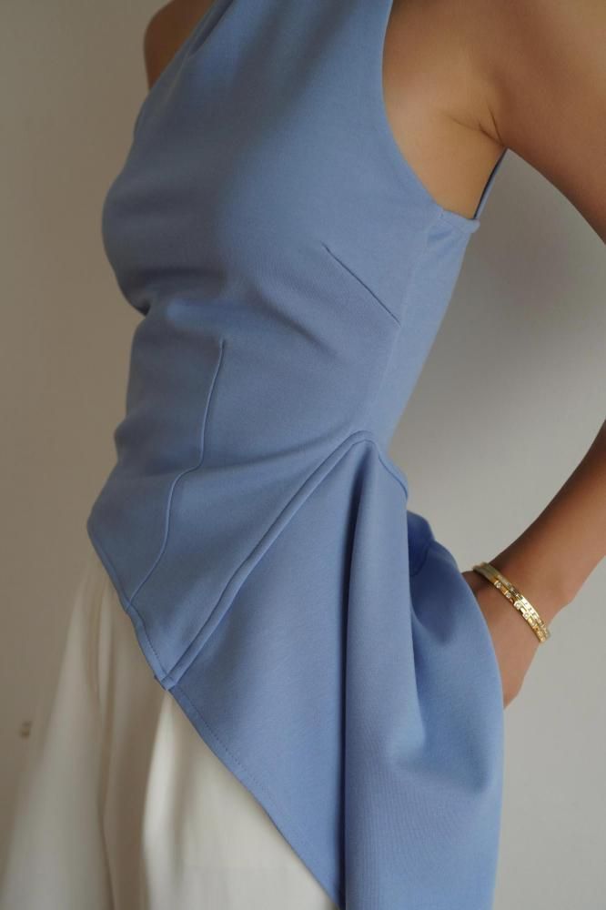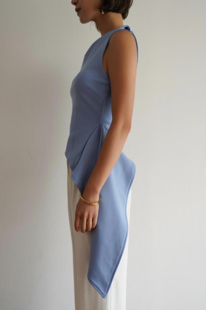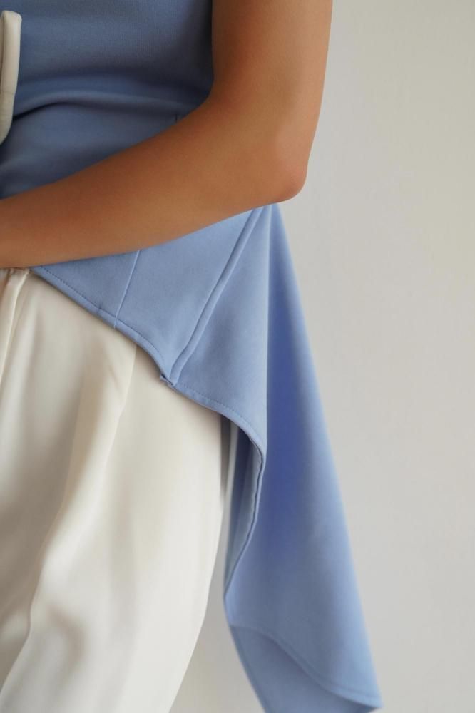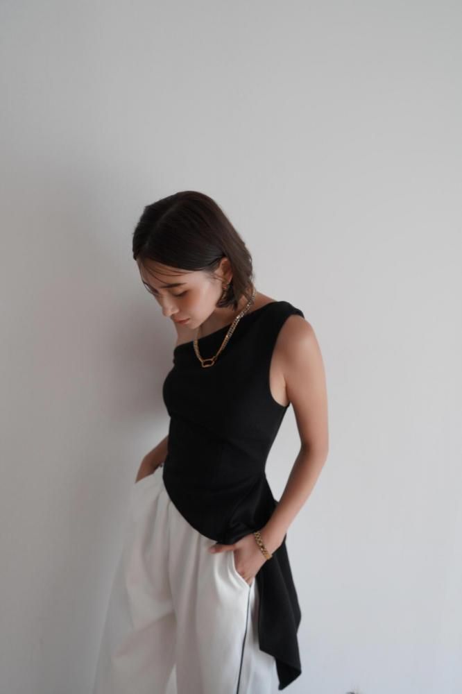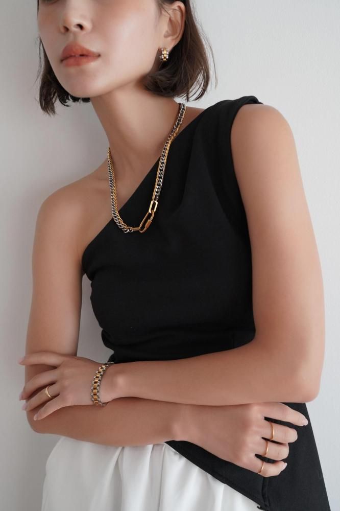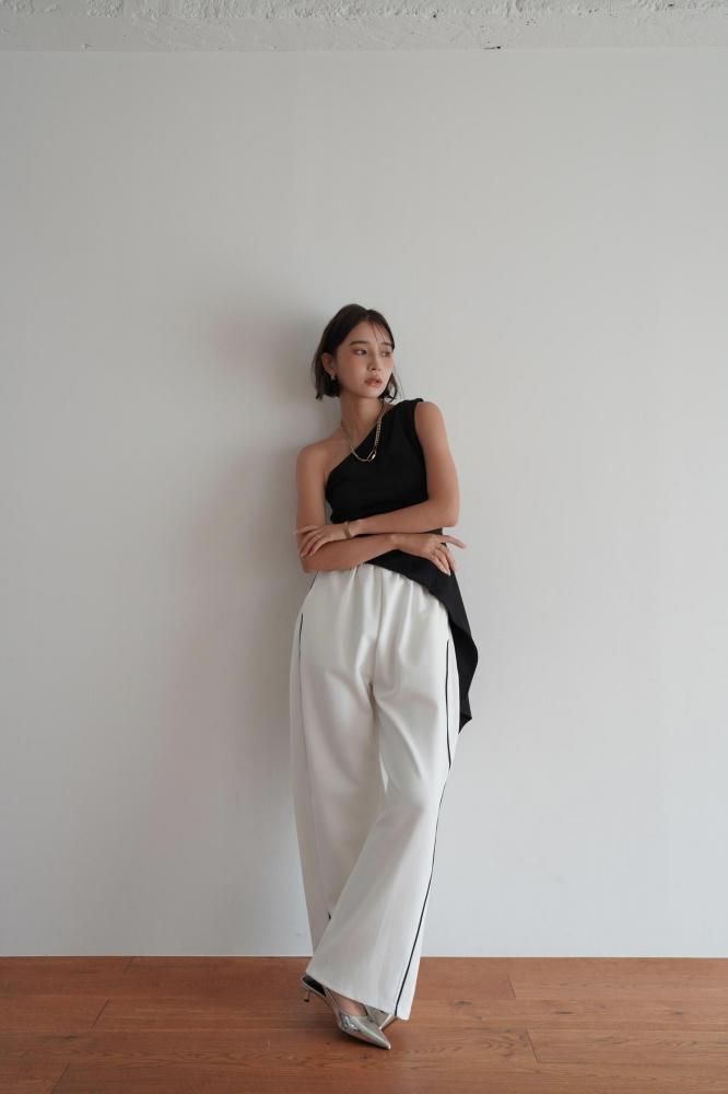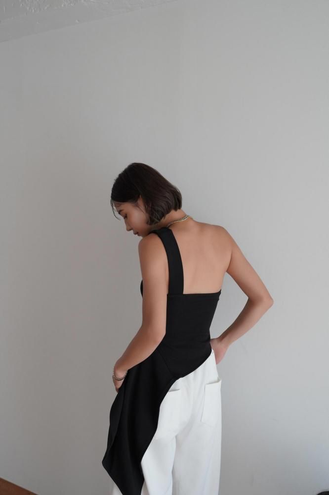 女性らしさを引き立てる、アシンメトリーなドレープが魅力のワンショルダートップス。