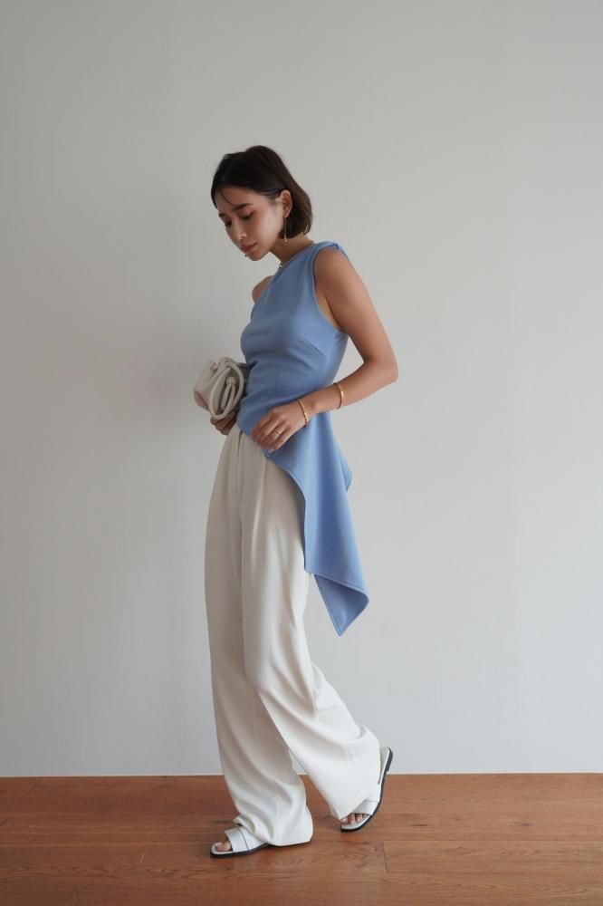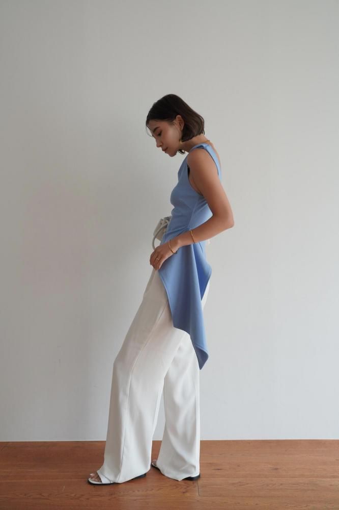 片側に流れるようなフリルデザインが目を惹き、シンプルながら存在感のある一枚に仕上がっています。