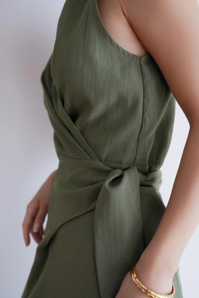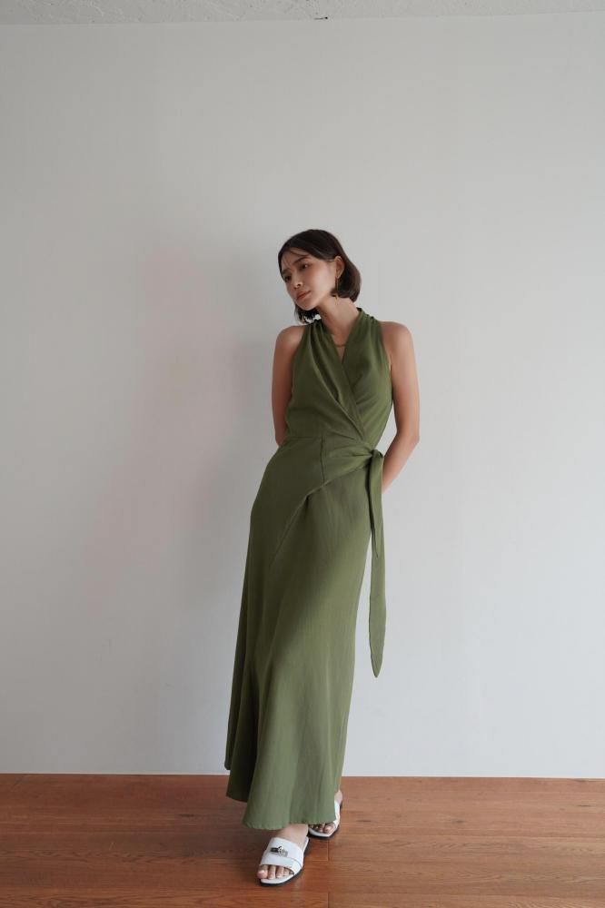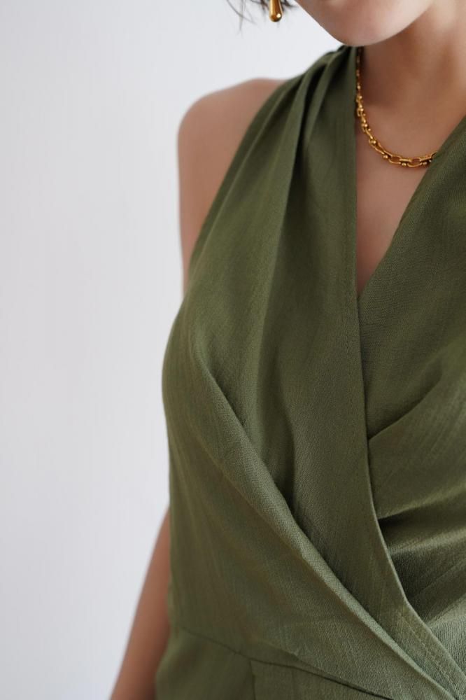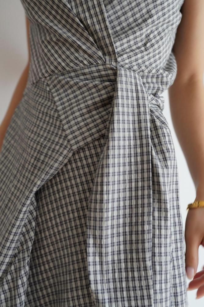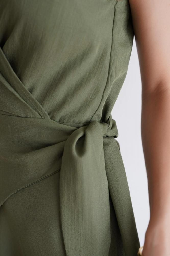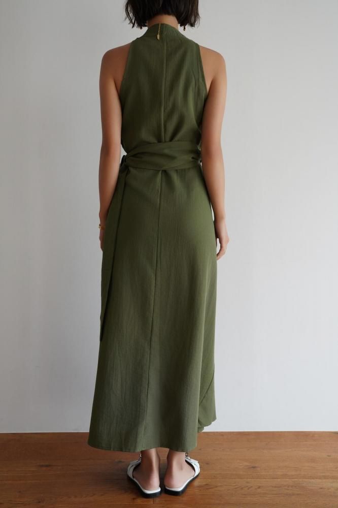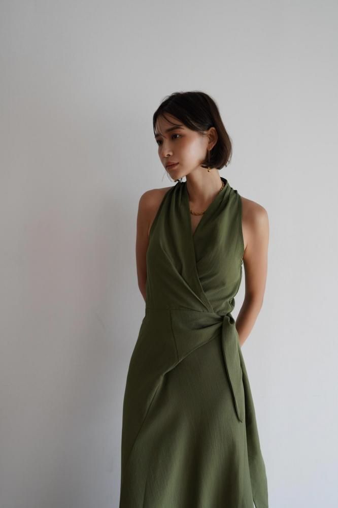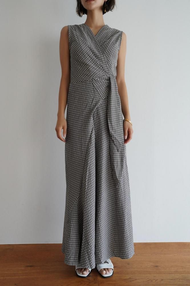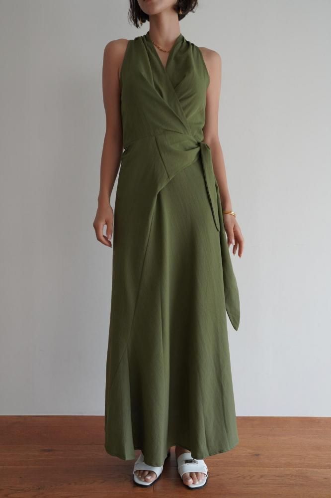 胸元のカシュクールデザインに、斜めに落ちるラップ風のドレープが動きのあるシルエットを生み出し、上品な印象を与えます。