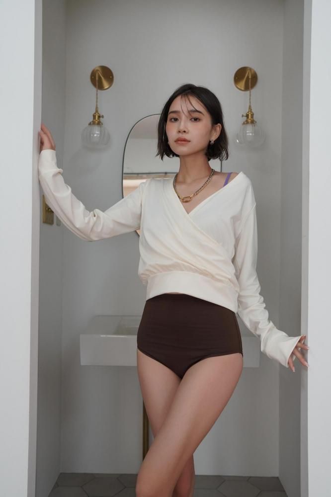 女性らしいシルエットを引き立てる、クロスデザインが印象的なラッシュガード。