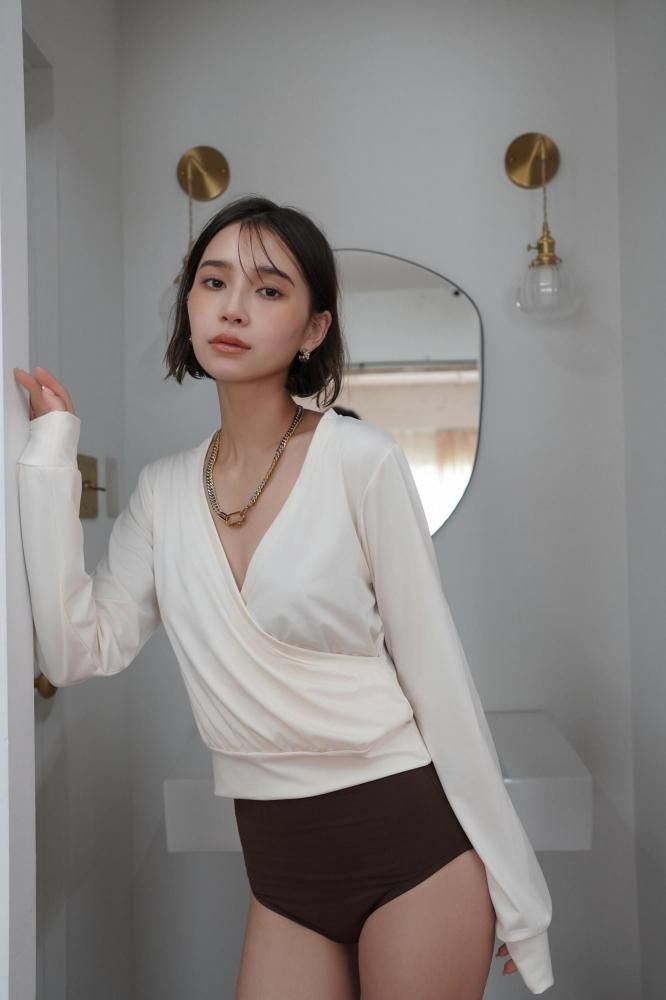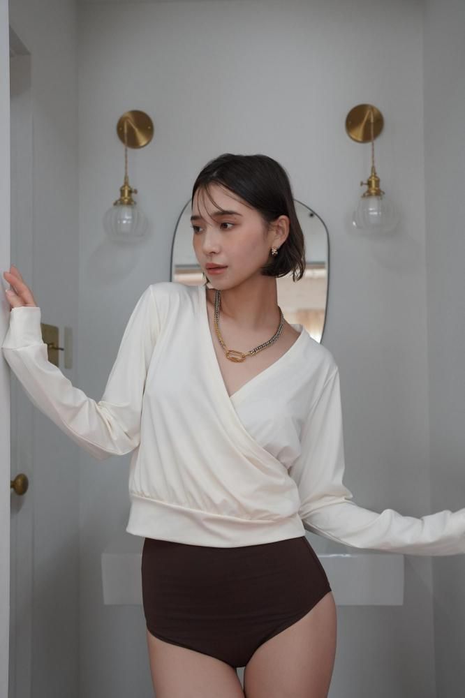 デコルテを美しく見せる深めのVネックと、体に優しくフィットする柔らかな素材感で、機能性とデザイン性を両立。