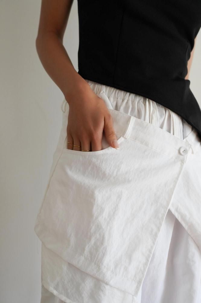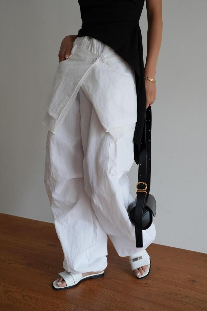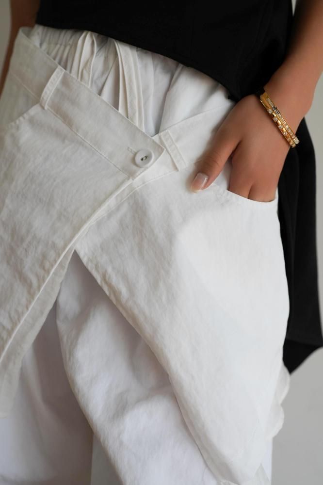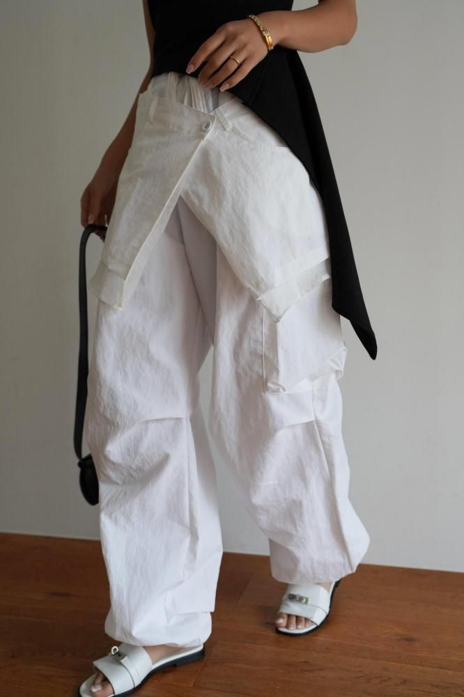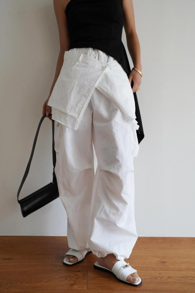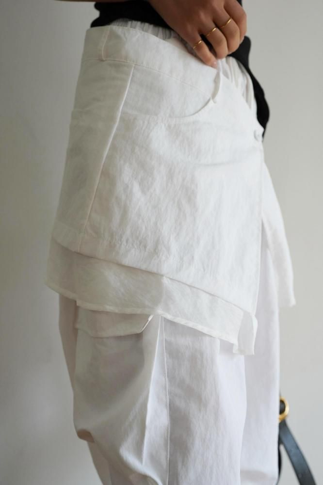 ☑ユニークな立体レイヤーデザインが目を惹く、スカートレイヤードパンツ。