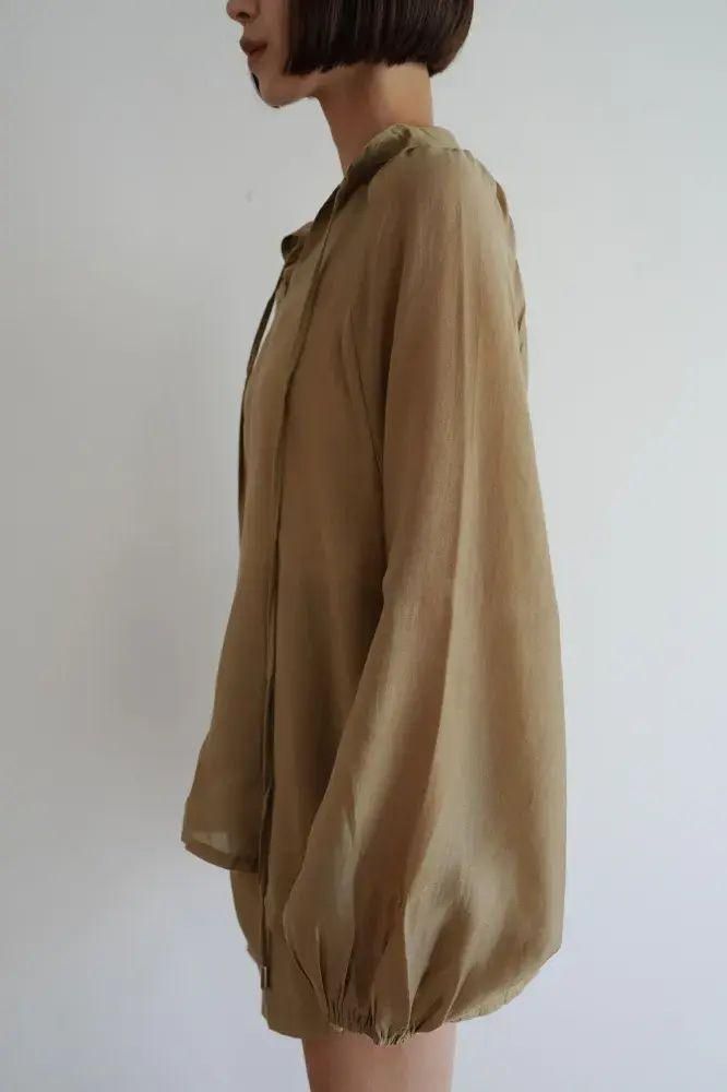 ふんわり袖が女性らしく柔らかい印象をプラスし、首元の華奢なリボンでさりげなく抜け感を演出。