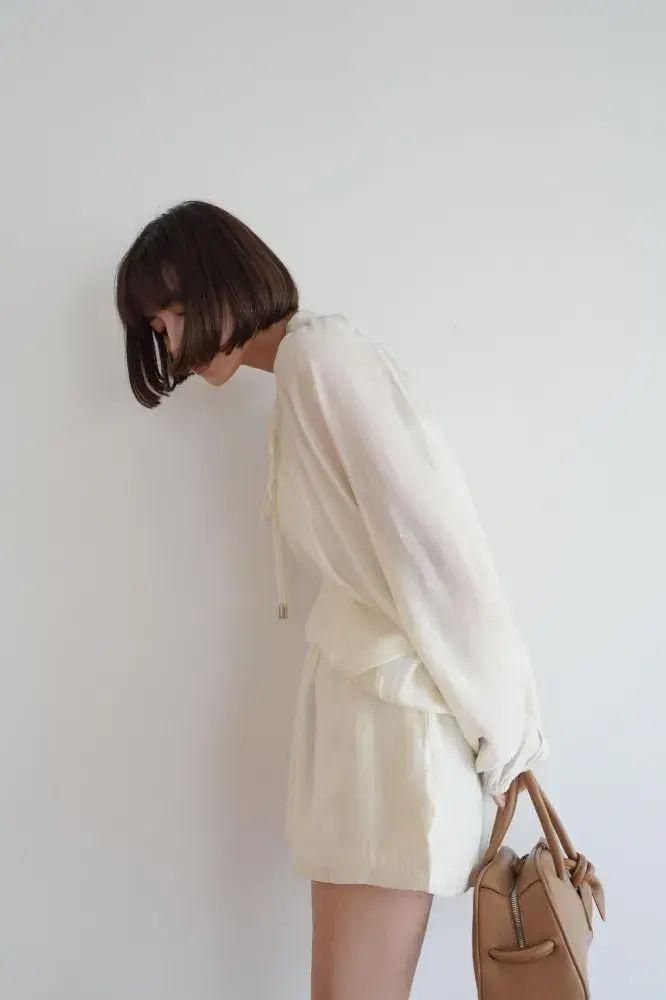 ゆったりとしたボリュームスリーブブラウスと、リラックス感のあるショートパンツが一体になった大人の女性らしさのある一着。