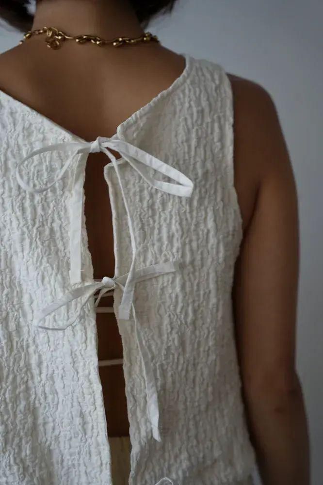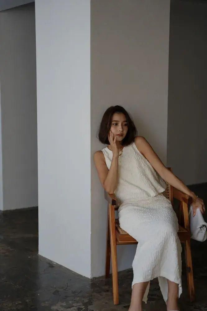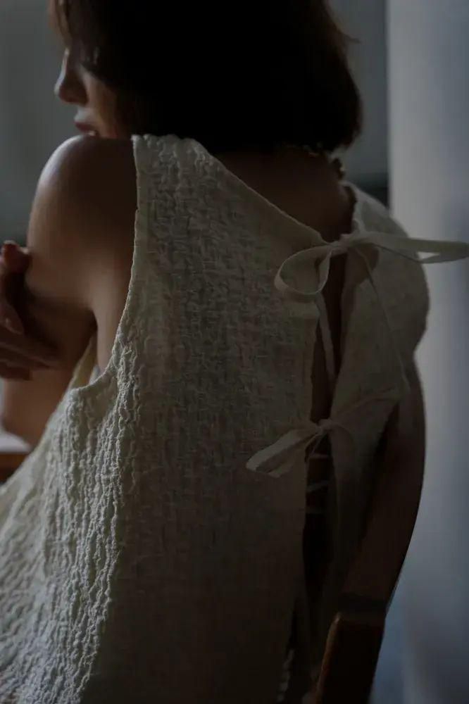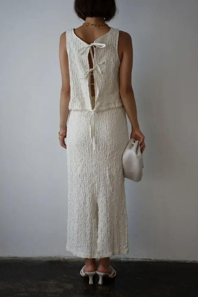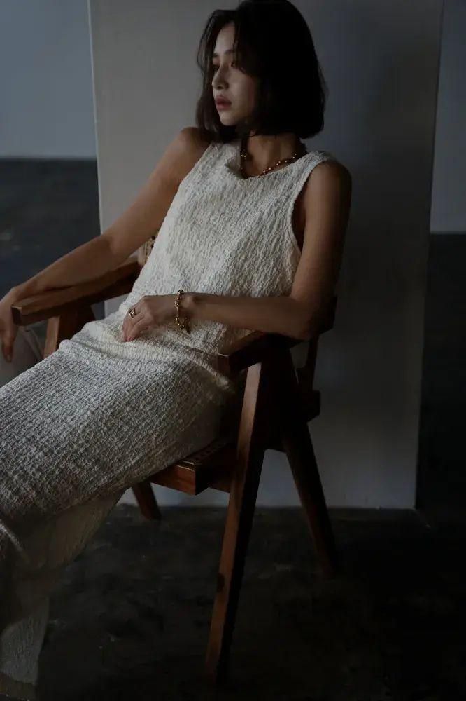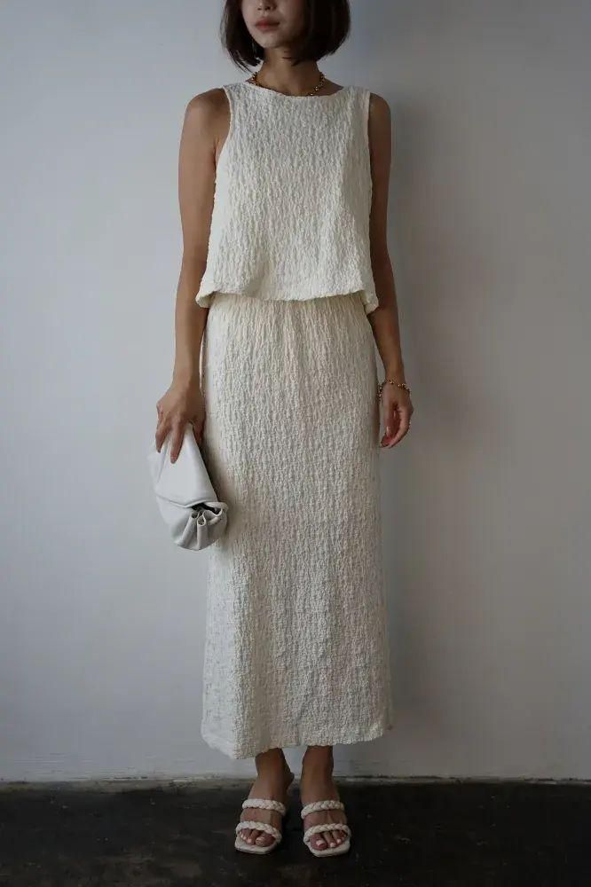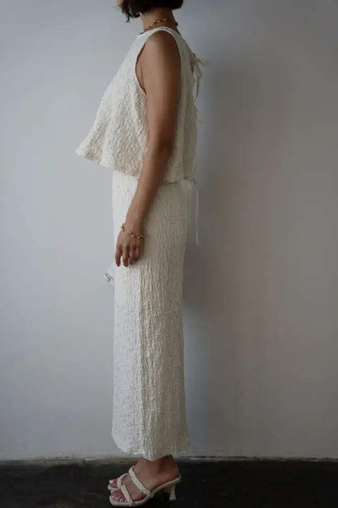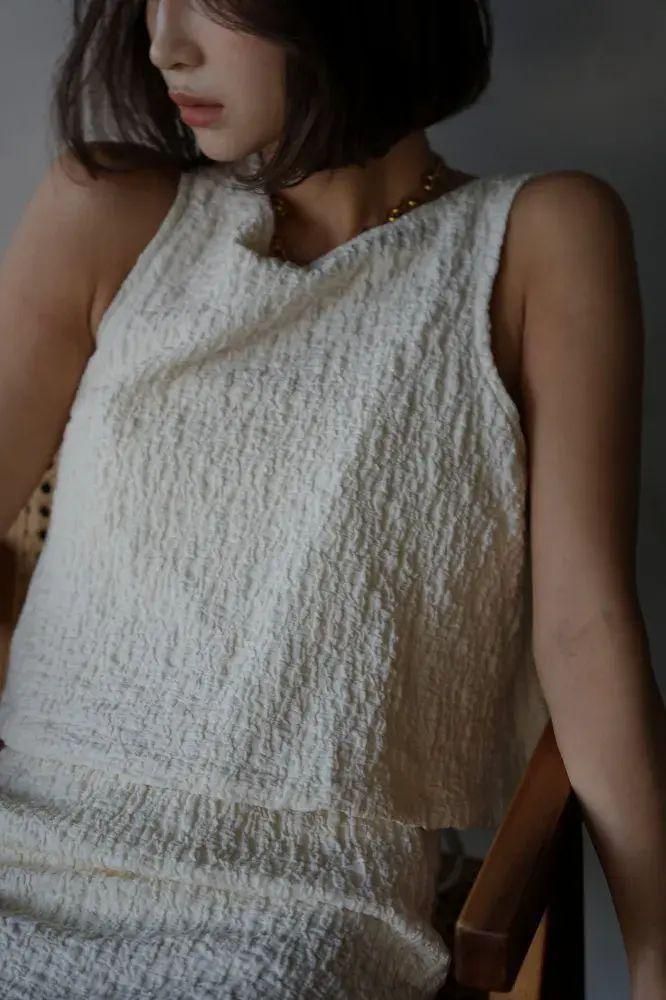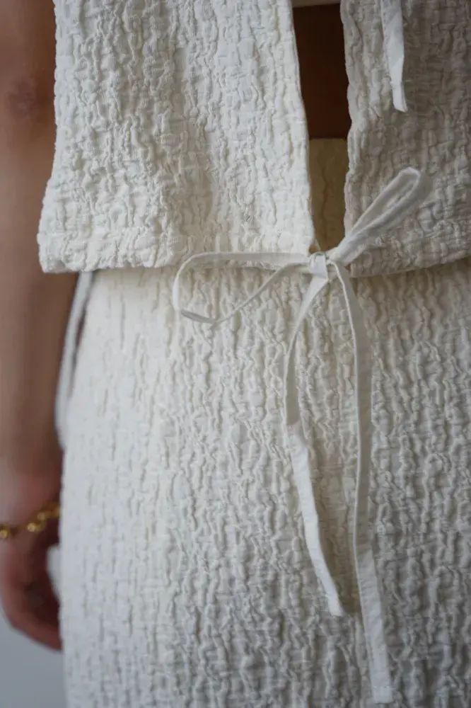 生地全体に施されたクリンクル加工の立体感が特徴で、シンプルながらも洗練された印象を与えます。