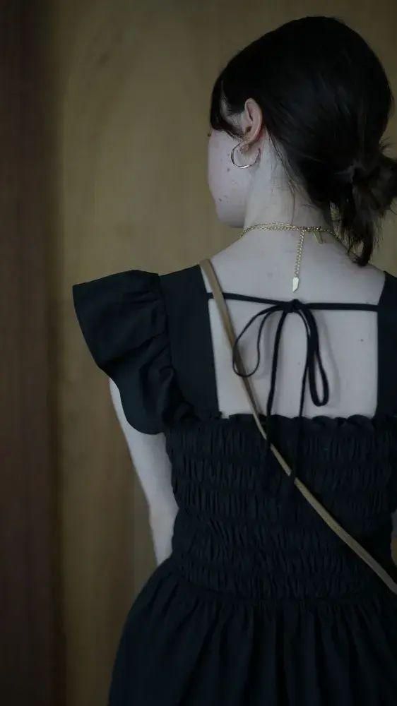 ノースリーブのショルダーにフリルを施した華やかなデザイン。