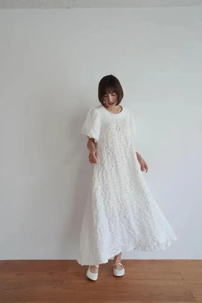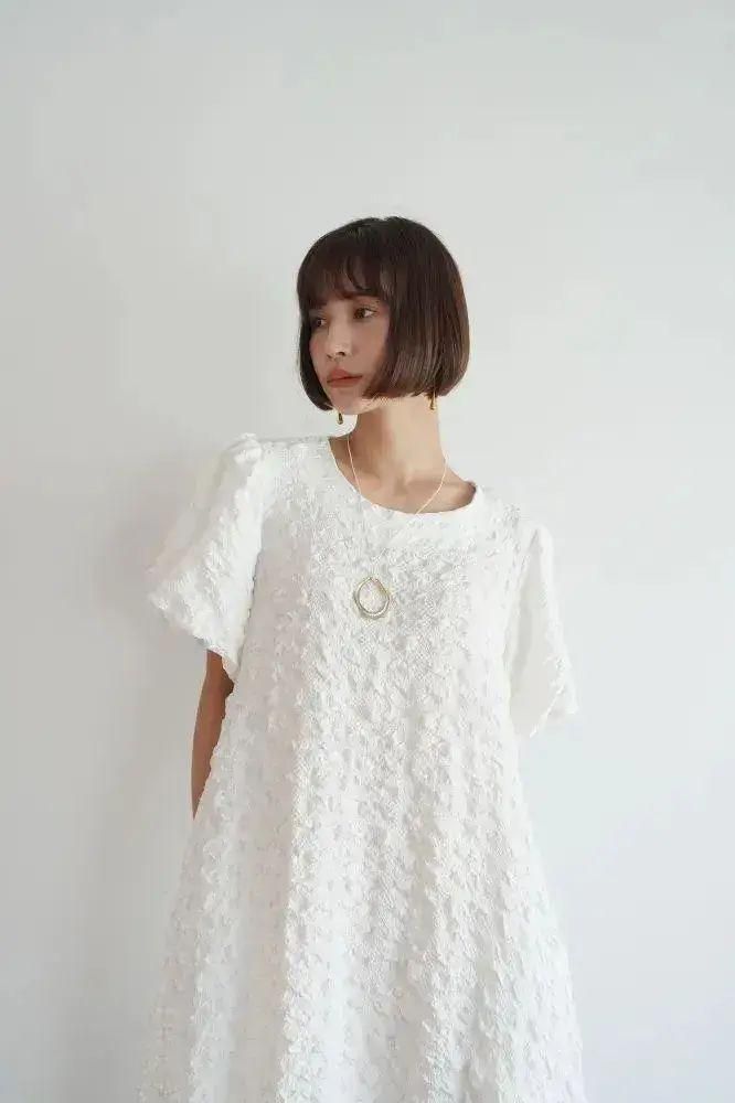 繊細なテクスチャーを全体に豊かに施し、ふわふわとした印象がありながらも上品な女性らしさのあるドレスのようなデザイン。