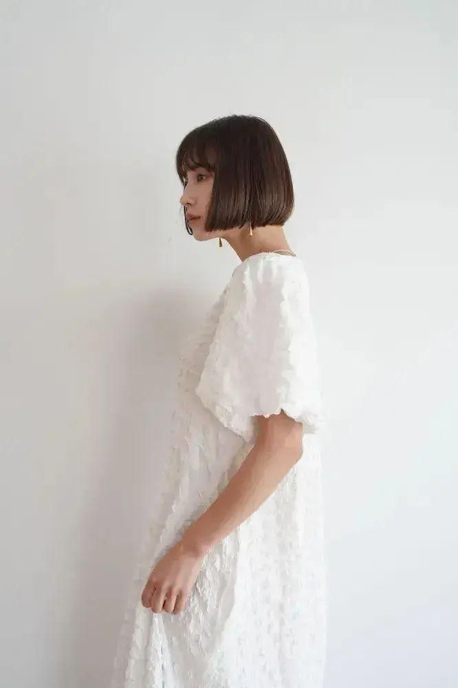 フェミニンな印象のパフスリーブと広がりを持たせたスカートが、動くたびに優雅なドレープを描き出します。