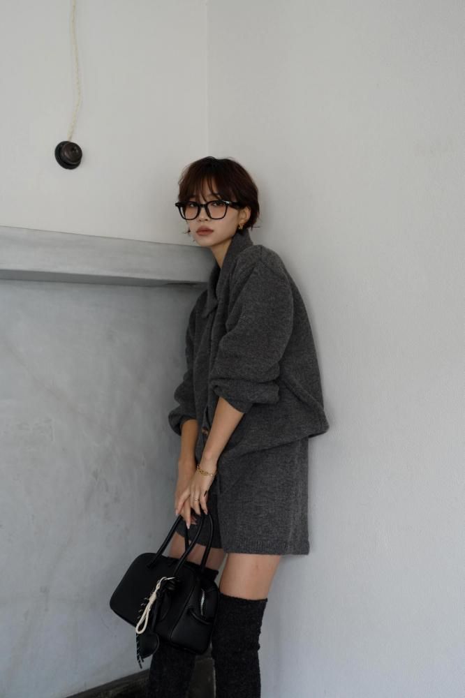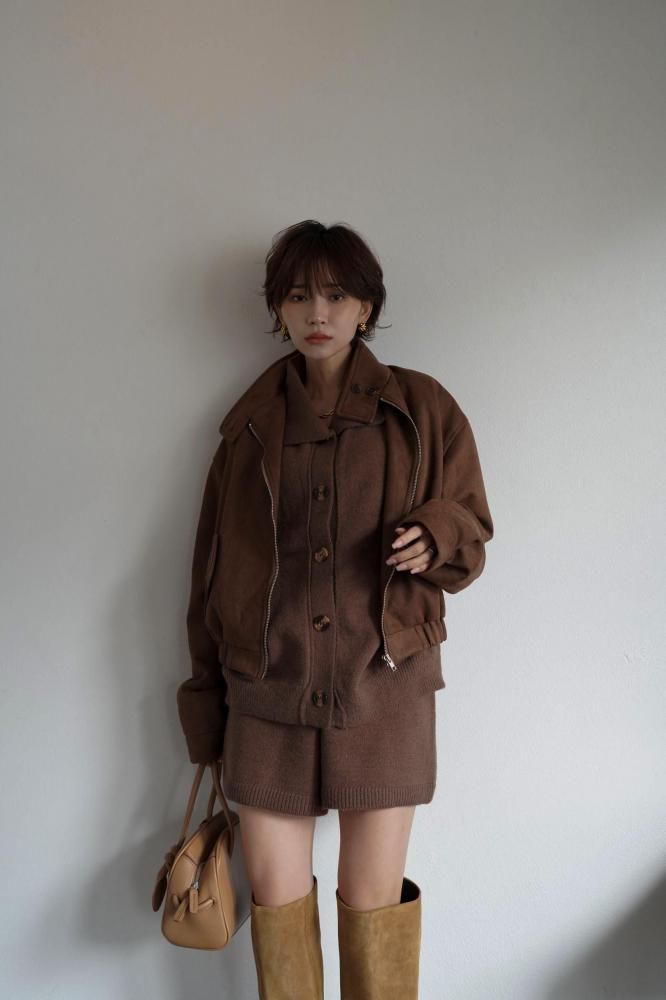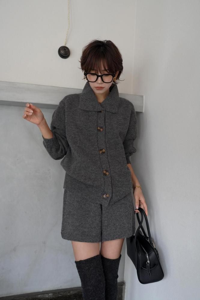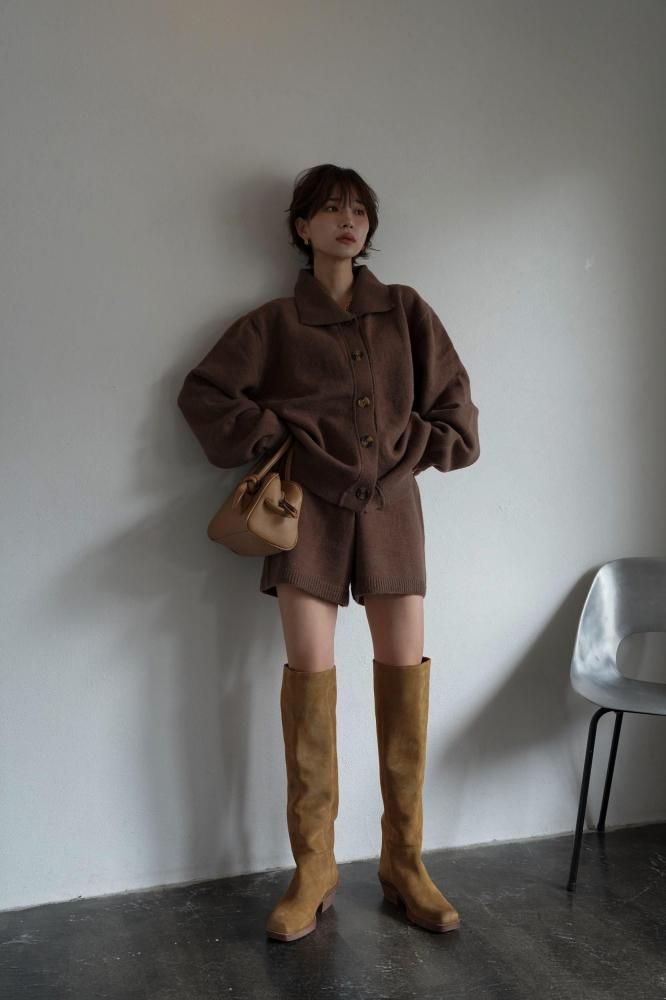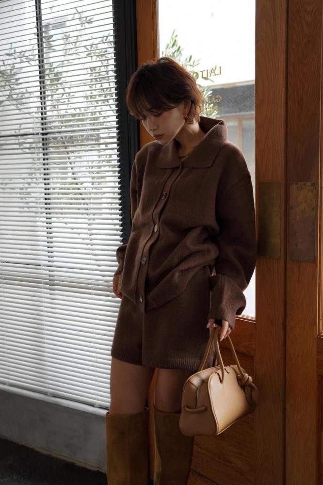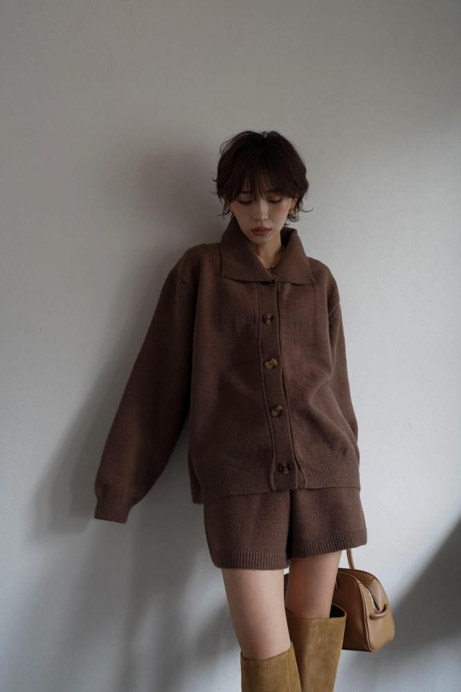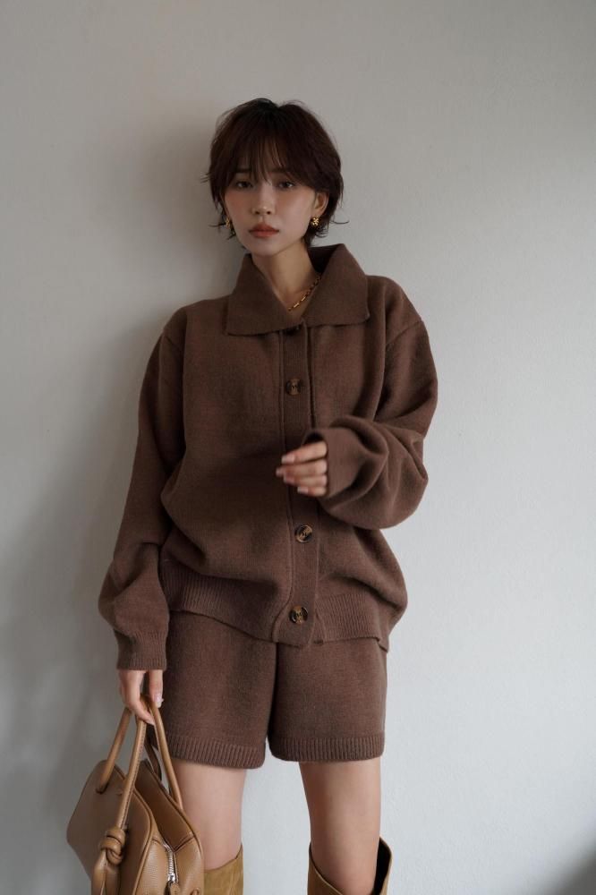 リラックスムード漂うニットカーディガンとショートパンツのセットアップ